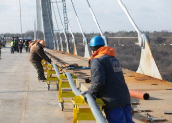 У Запоріжжі на вантовому мості завершується монтаж вантів. Вже встановлено 40 вантів, сьогодні мостобудівники встановлюють сталеві канати № 41,42,43 та ...