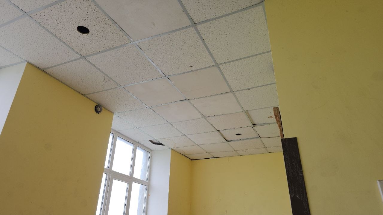 Ксенія показує на стелю, яка потребує ремонту. Мама юного футболіста наголошує: проблема не в естетиці, а в тому, що приміщення, на думку батьків, є просто небезпечним для дітей. Конструкції, що звисають зі стелі можуть впасти і травмувати дитину, каже вона.
