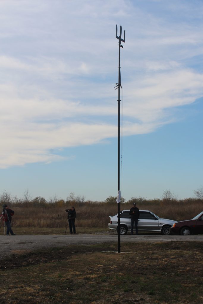 Флагшток вийшов чималий – заввишки приблизно 7,5 метрів. Ще приблизно два метри забетоновано в землю, щоб конструкція міцно трималася. Його складено з труб, які находять одна на одну, тож загальна довжина усього використаного матеріалу – десь 12 метрів.