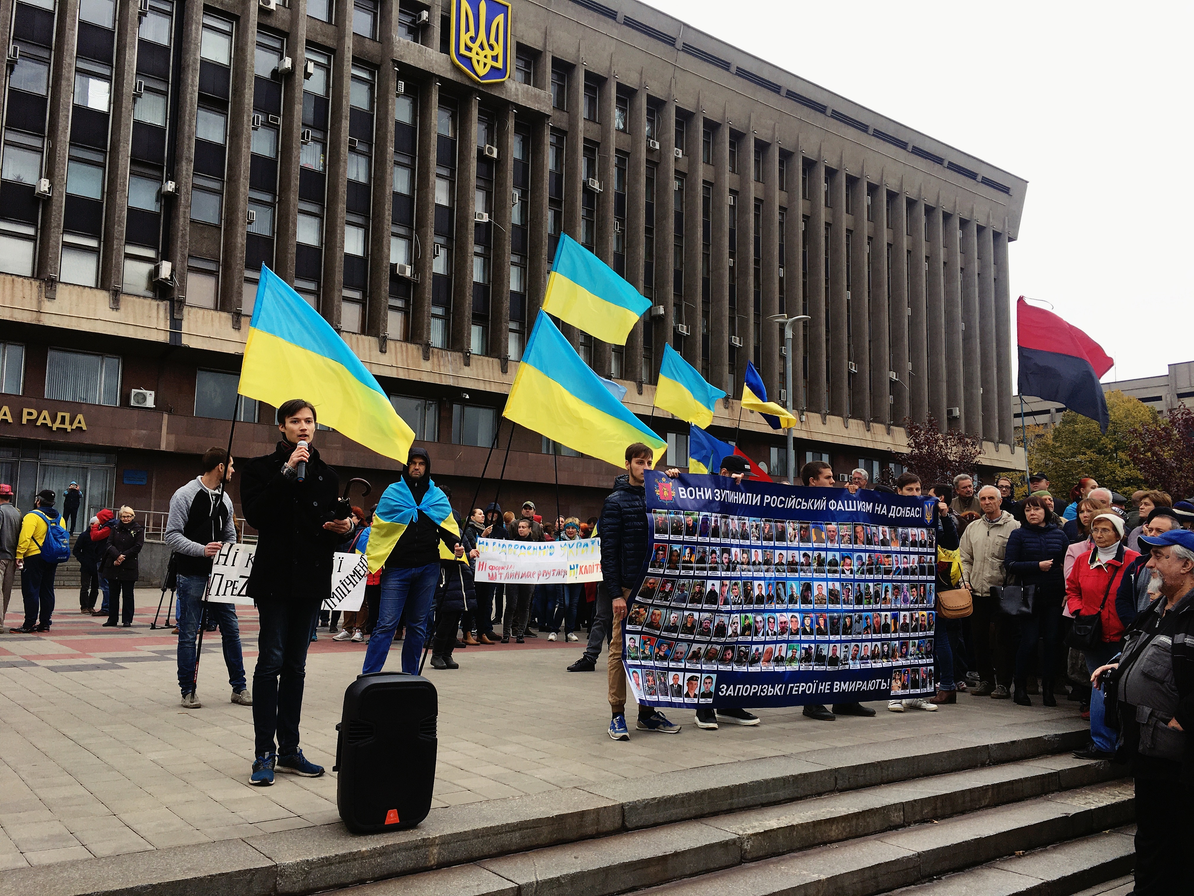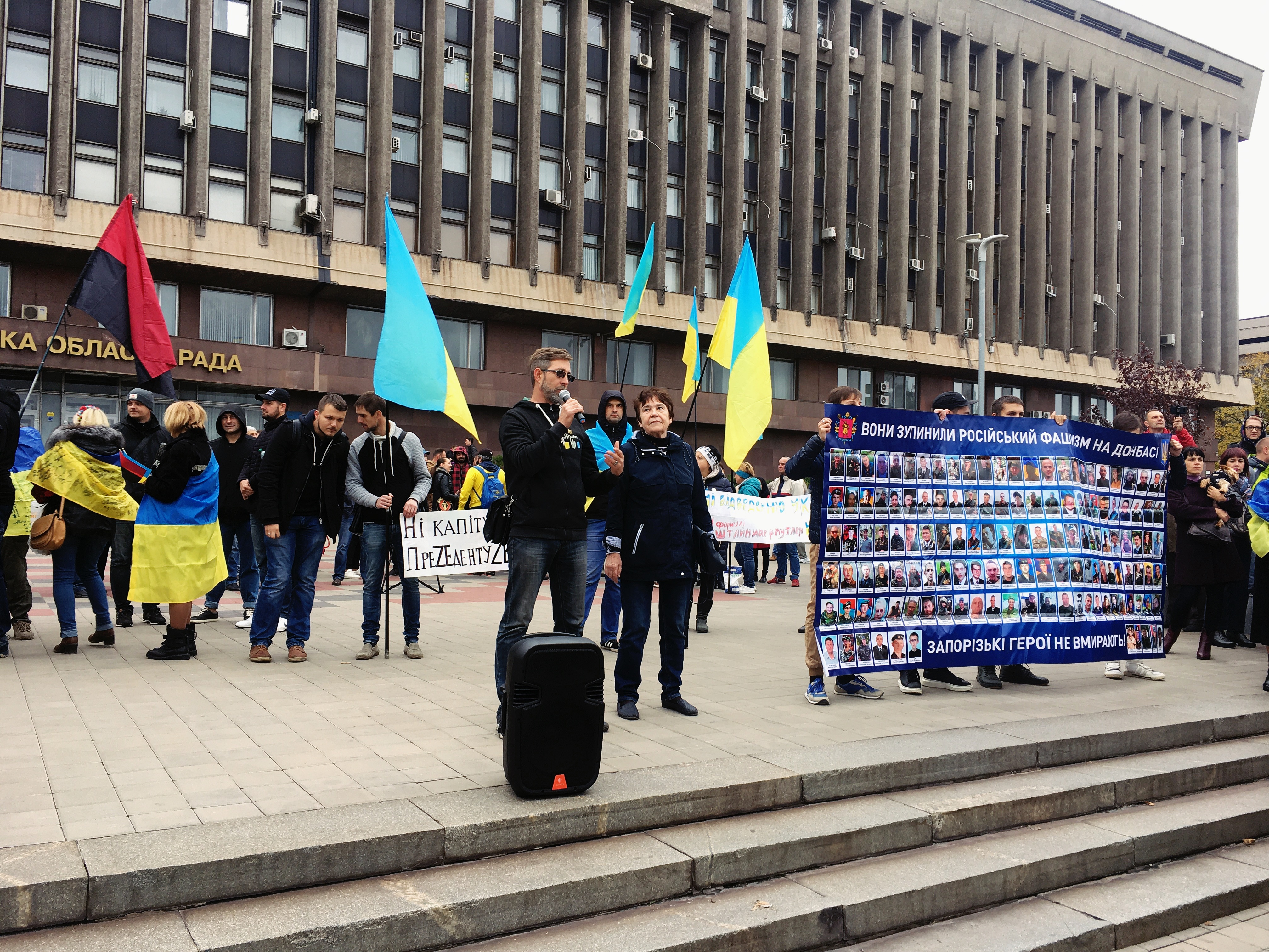 На сцені виступили громадські активісти, волонтери, ветерани АТО та ООС та містяни. Більшість людей прийшли з українськими прапорами, символікою, принесли плакати з написом “Ні капітуляції”.