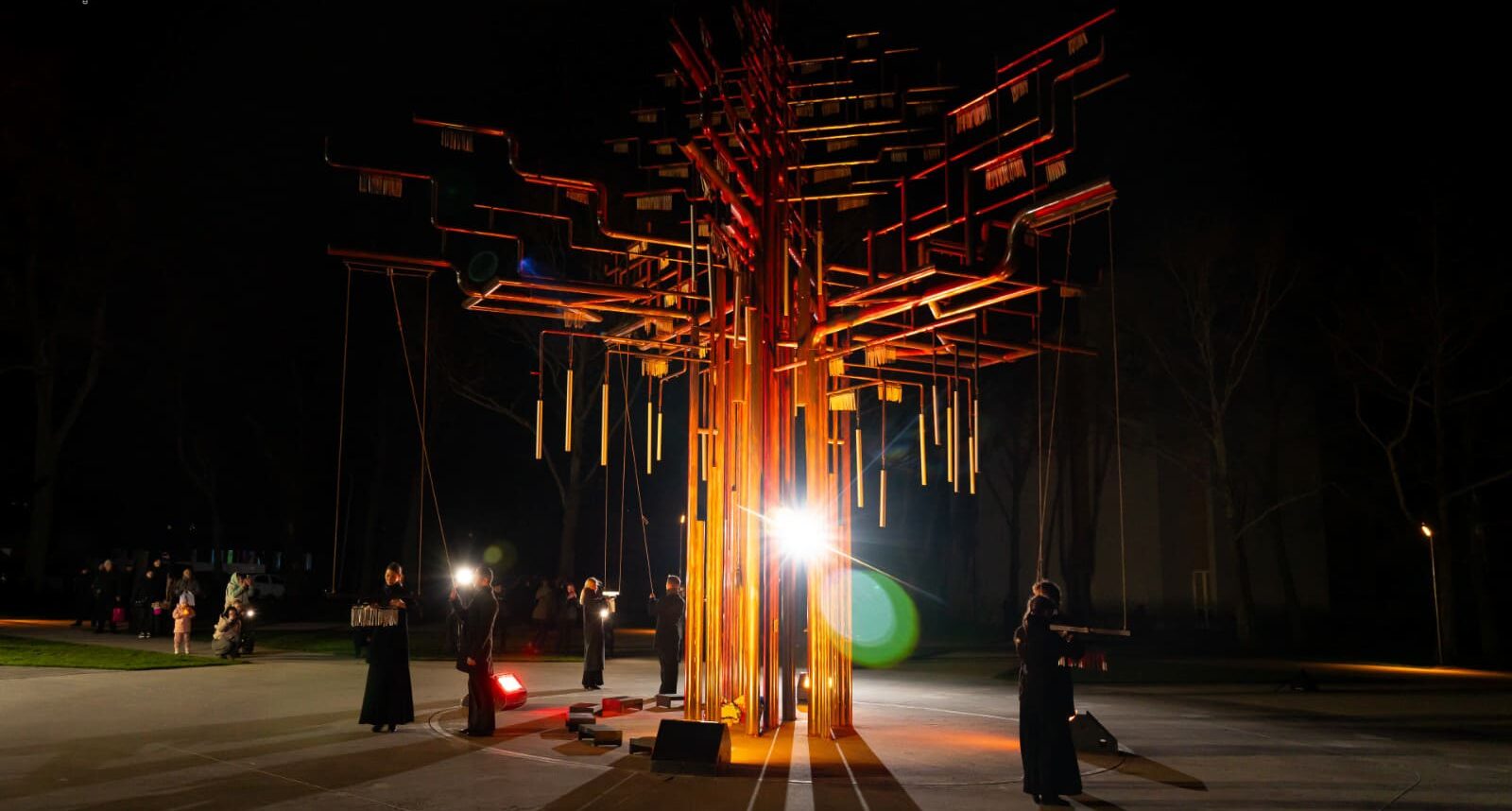На металевих «гілках» — трубки замість листя, на кожній викарбувано ім’я полеглого захисника чи захисниці. Вони створюють передзвін, як символ відлуння голосів полеглих Героїв.