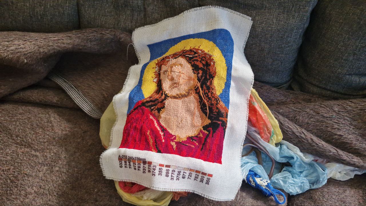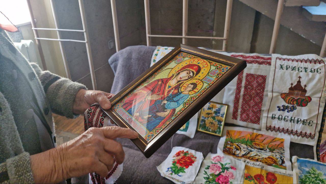 87-річна Антоніна Василівна, переселенка з села Інженерне, в шелтері у Запоріжжі готується до свят. Жінка вишиває ікони, які потім дарує людям.
