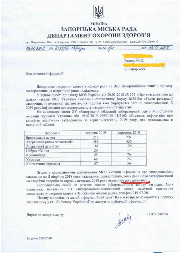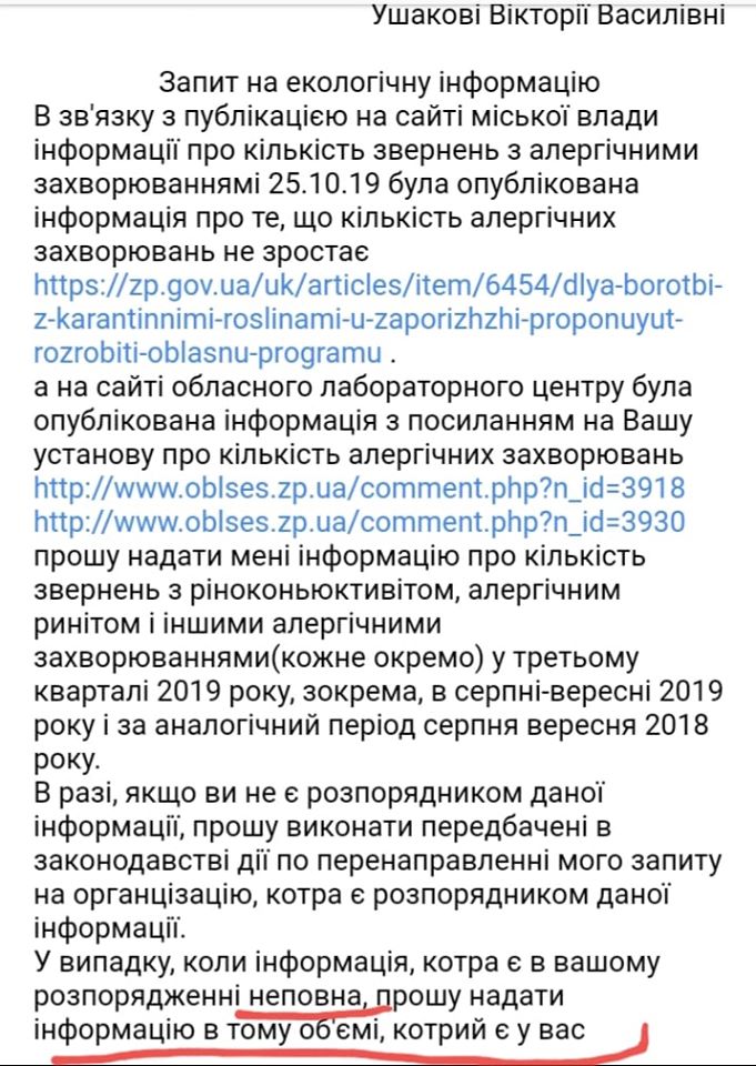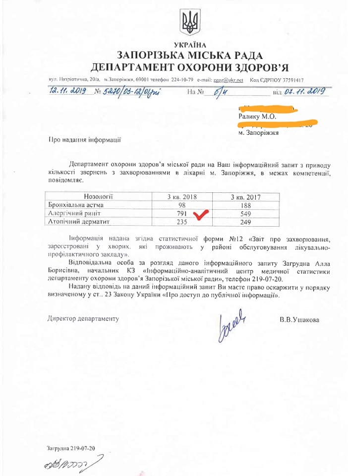 Микола Ралик зробив запит до Департаменту охорони здоров’я Запорізької міськради з приводу кількості захворюваних у нашому місті на алергічний ринокон’юнктивіт. Через деякий час установа надіслала відповідь, однак активіст проаналізувавши її прийшов до висновку, що в документі вказана недостовірна інформація.