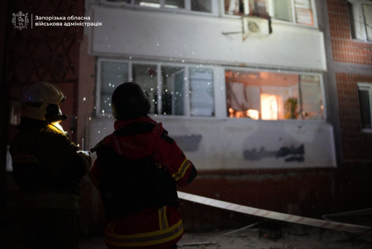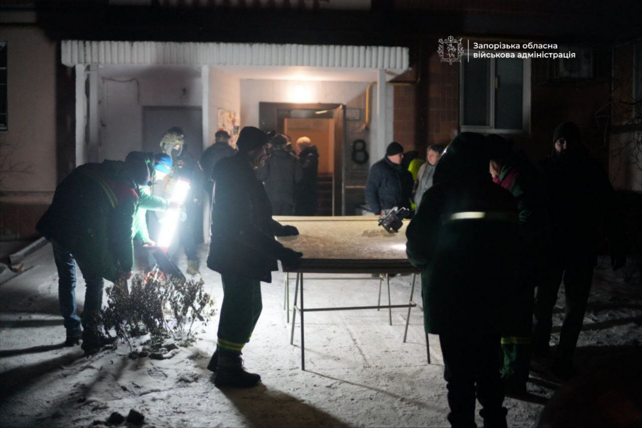 Закриті вікна в двох багатоповерхівках, які постраждали внаслідок ворожої атаки на Запоріжжя. З ночі комунальники працюють на місцях руйнувань, повертаючи життя в пошкоджені оселі.