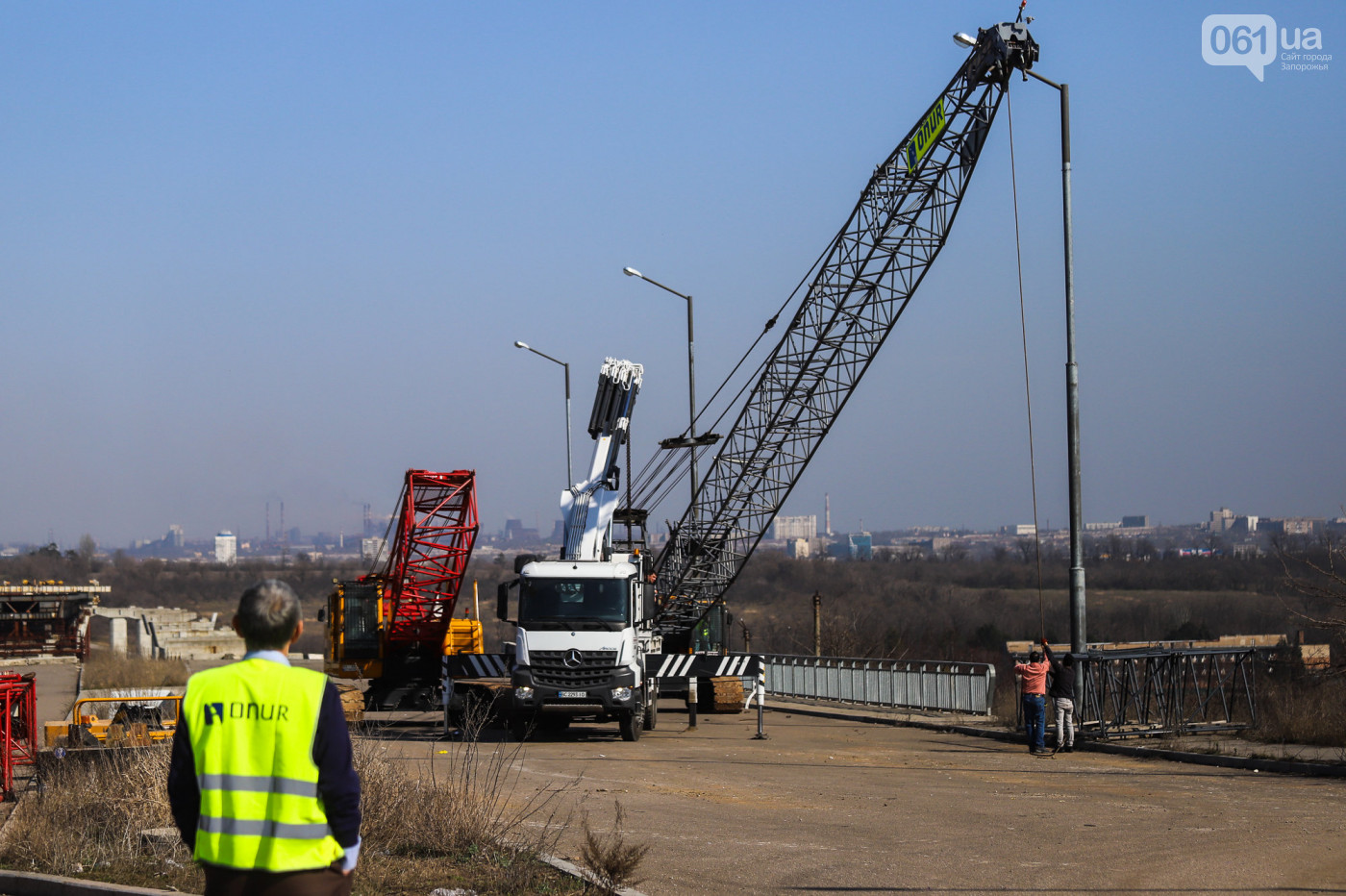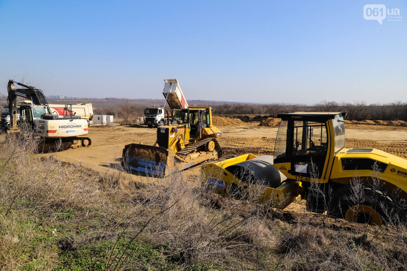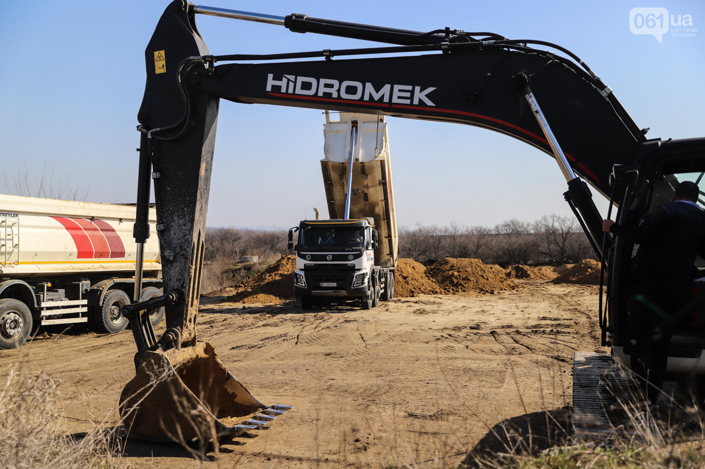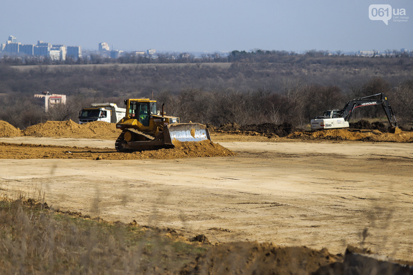 Вчора, 10 березня, біля недобудованих мостів через Дніпро компанія «Онур» почала облаштовувати будівельний майданчик та звозити сюди техніку, повідомляє «061».