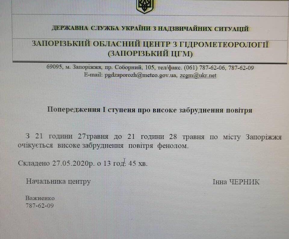 Запорізький обласний центр з гідрометеорології попереджав про високу концентрацію в повітрі фенолу. Проте відповідних застережних повідомлень не оприлюднювали на ресурсах.