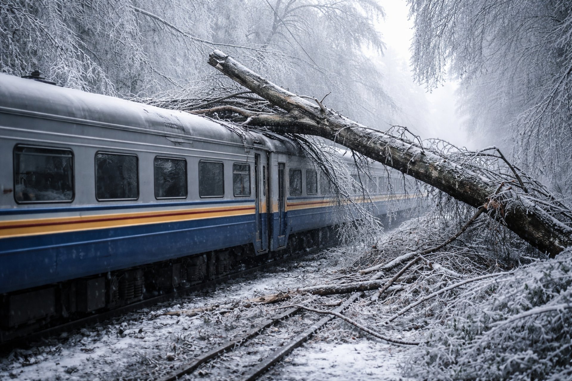 Виявлено щонайменше 10 місць, де повалені дерева пошкодили лінію електропередач та пристрої зв’язку та сигналізації, тому на колії виведено резервні тепловози.