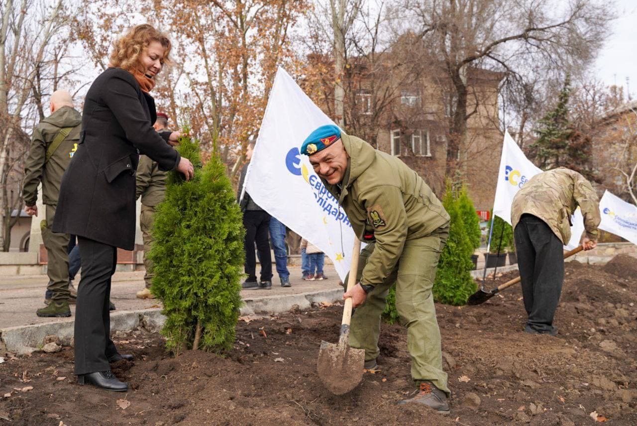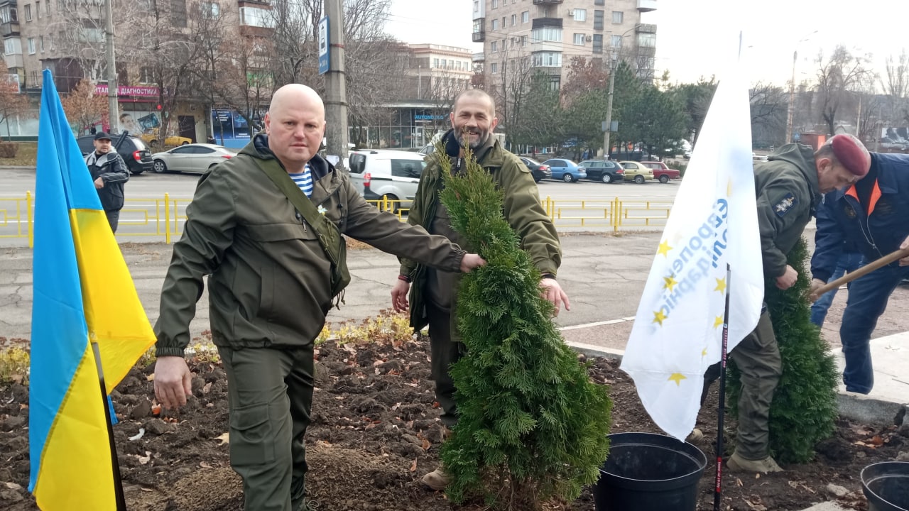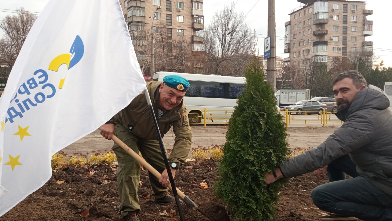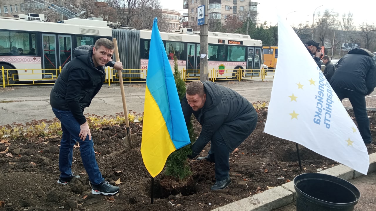 Вічнозелені туї, які партійці висадили в районі Транспортної площі, за рік стануть окрасою скверу Платонівського. Особливу присвяту партійці зробили безпосередньо під час заходу: два дерева на алеї висадили на згадку про нещодавно загиблих військовослужбовців — підполковника Руслана Прусова та майстер-сержанта Вадима Федосеєва. Обидва служили в 79-й окремій десантно-штурмовій бригаді. Вшанували пам’ять про бійців хвилиною мовчання.