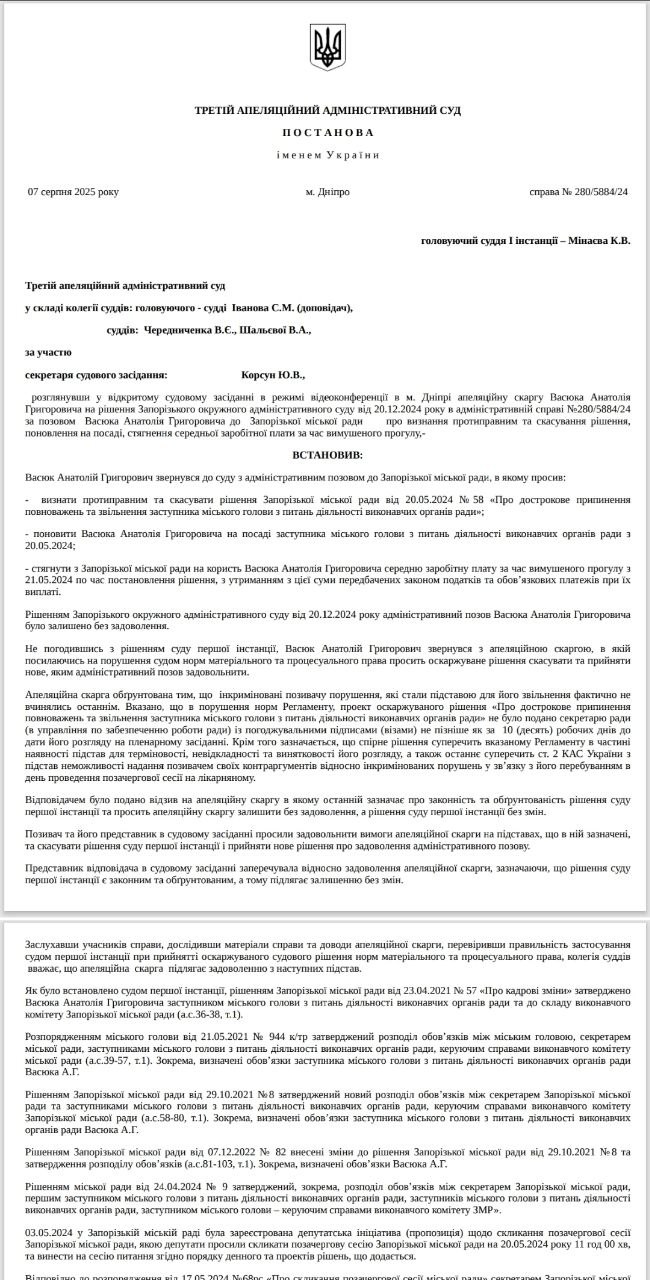 Читайте також: Екс-заступник мера Запоріжжя виграв суд щодо свого звільнення: Анатолій Васюк прокоментував, чи збирається повертатись на посаду