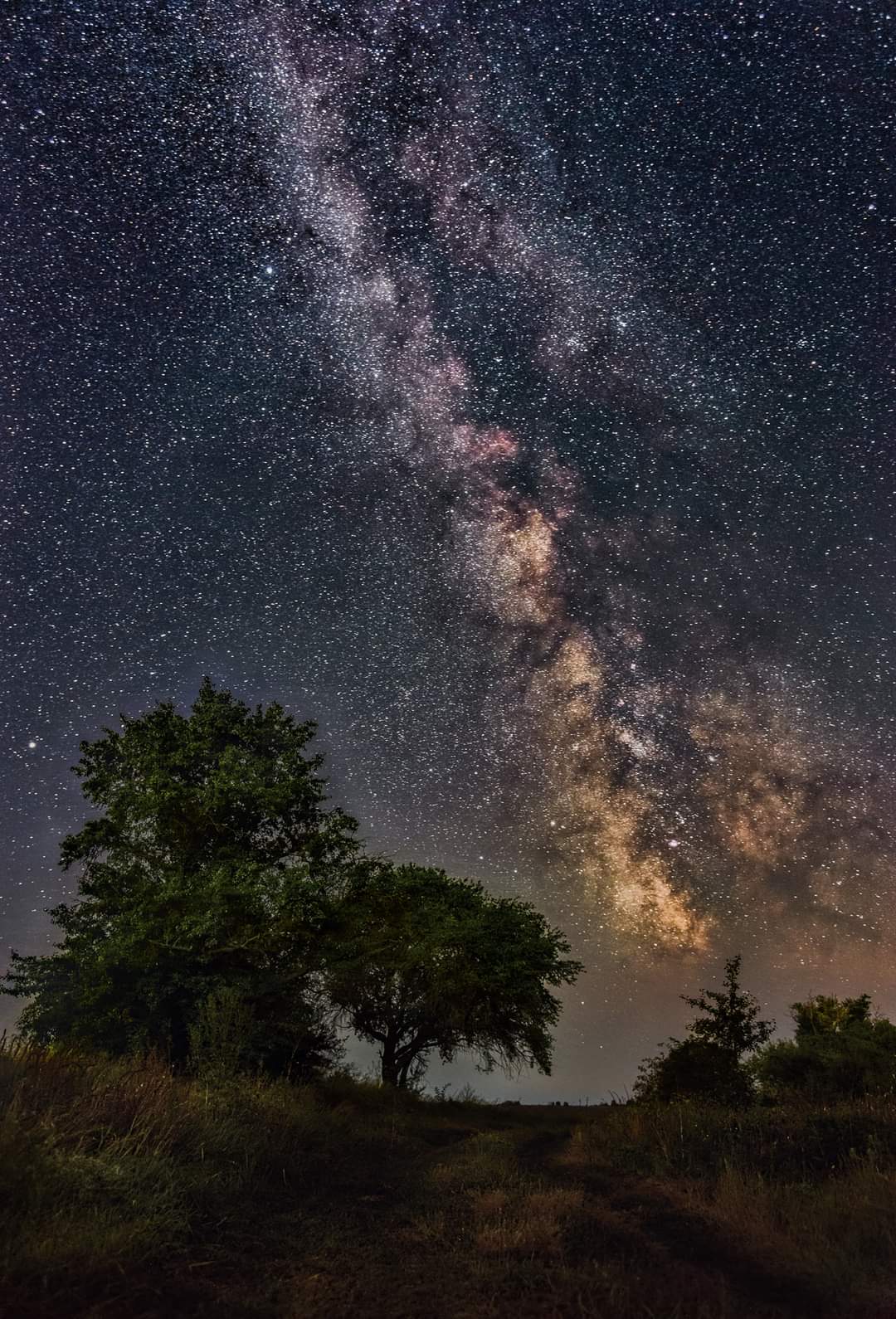 «Точка зйомки приблизно на середині ґрунтової дороги. Ось тут, після 22-ї години, вже було досить чітко видно Чумацький Шлях навіть неозброєним оком. Навколо тиша, зоряне небо, спів цикад і крики сов, позаду на полях комбайн збирав пшеницю …», — пише автор.