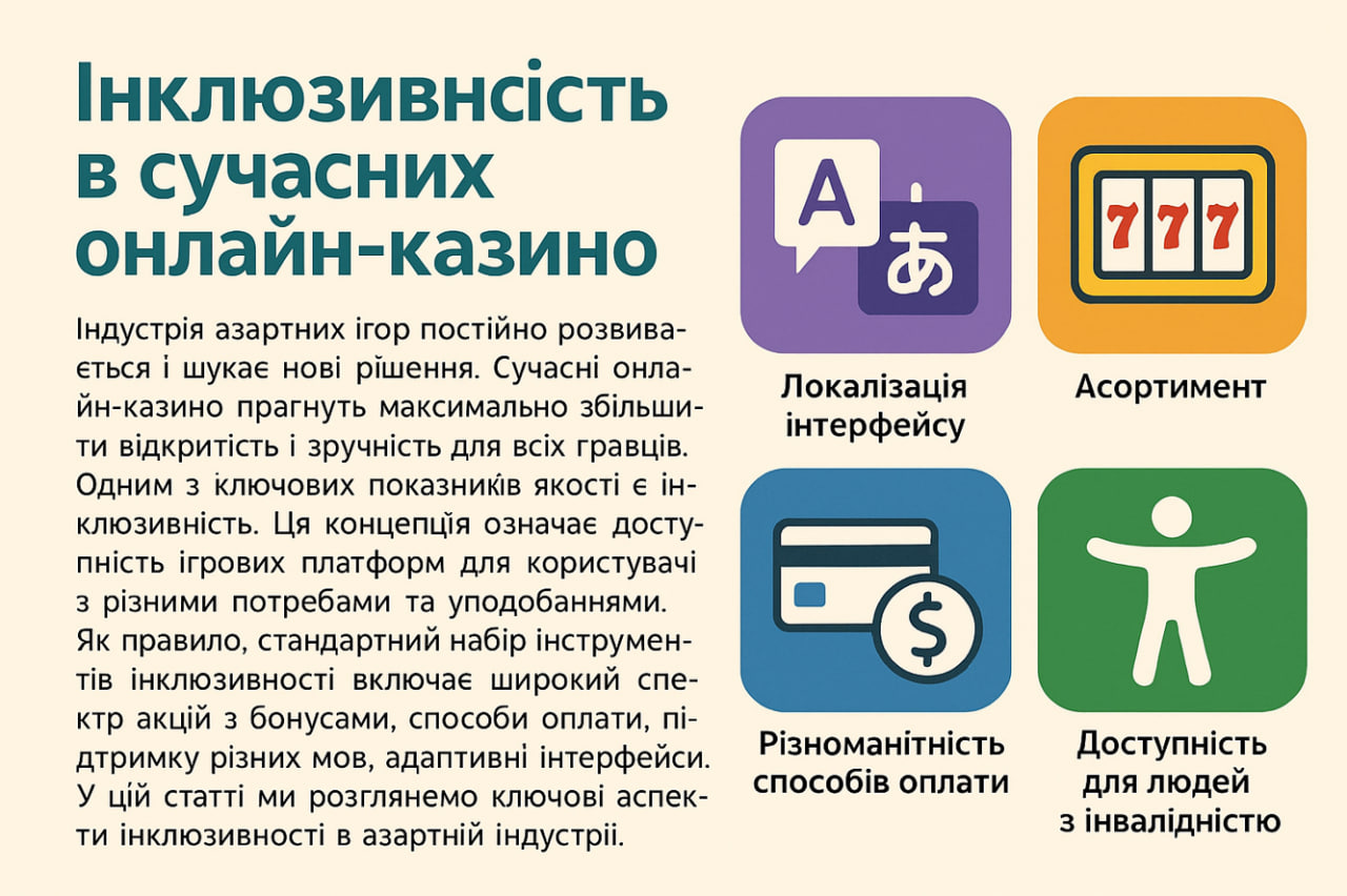 Індустрія азартних ігор постійно розвивається і шукає нові рішення. Сучасні онлайн-казино прагнуть максимально збільшити відкритість і зручність для всіх гравців. Одним з ключових показників якості є інклюзивність. Ця концепція означає доступність ігрових платформ для користувачів з різними потребами та уподобаннями. Як правило, стандартний набір інструментів інклюзивності включає широкий спектр акцій з бонусами, способи оплати, підтримку різних мов, адаптивні інтерфейси. У цій статті ми розглянемо ключові аспекти інклюзивності в азартній індустрії.</p>