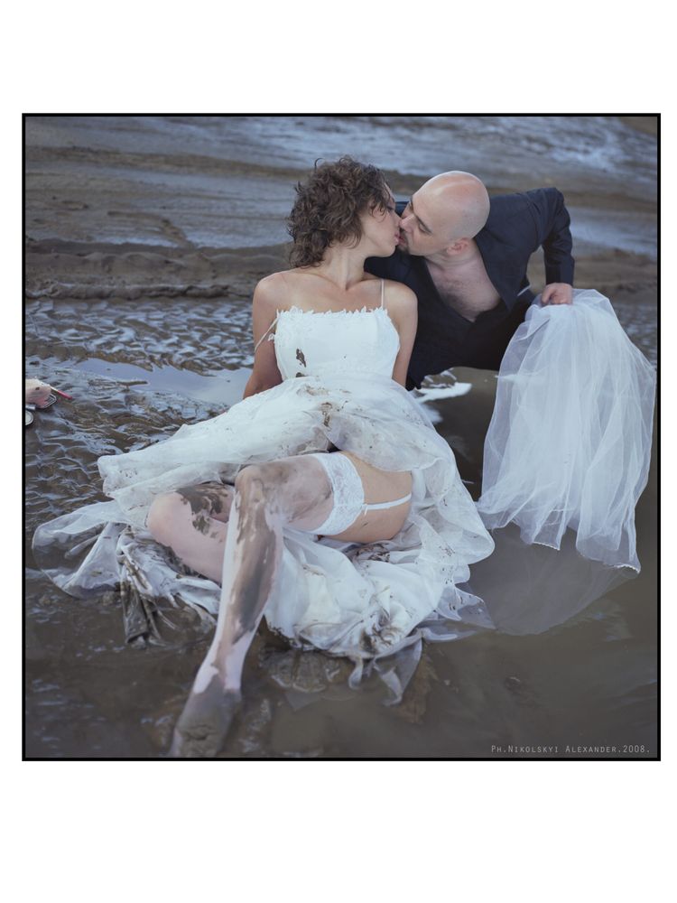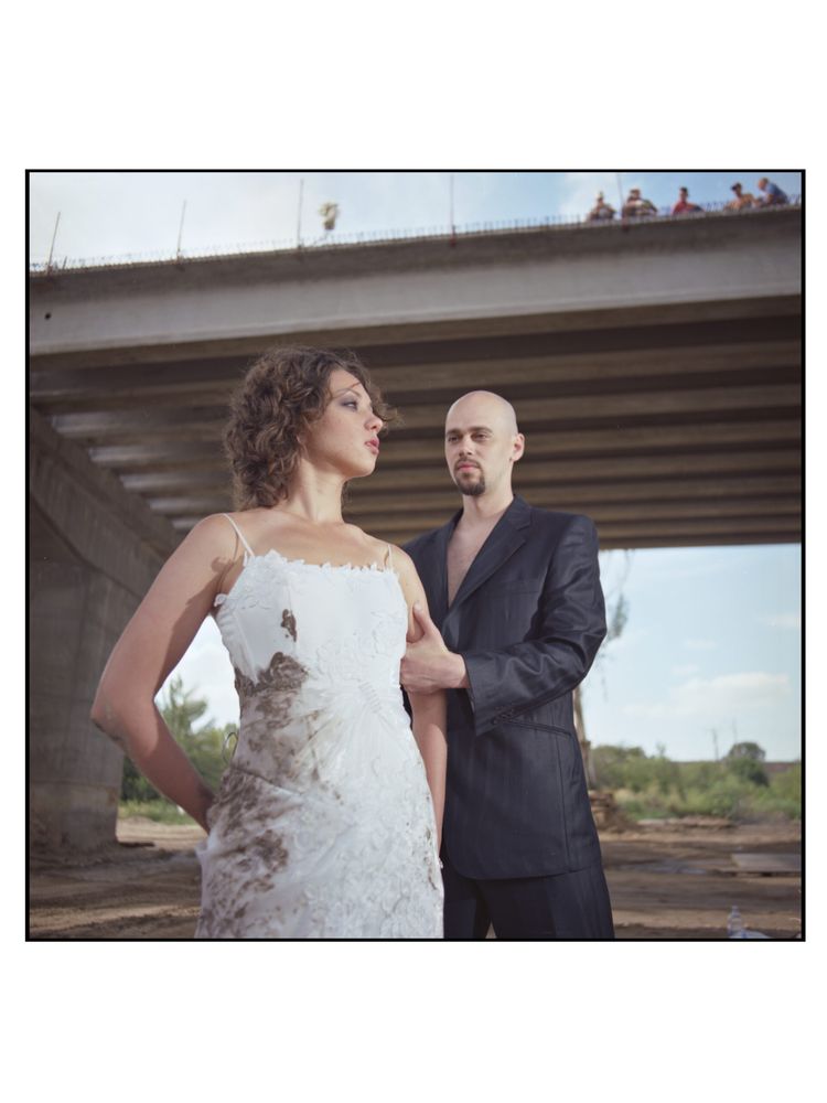 Ми дуже хотіли весільну фотосесію у воді. Спеціально для цього придбали сукню, щоб можна було сміливо псувати, і почали вмовляти нашого фотографа. Йому, в свою чергу, хотілось аби ми забруднились в багнюці. Домовились на пропозиції, що спочатку замажимось, а потім підемо у воду і змиємо все це. Словом, знайти достатньо бруду наприкінці липня було важко, але нам вдалось відшукати його під мостами. Жбурнули ми Юлю у білій сукні в багнюку, я заболотив увесь костюм, але кадри таки зробили. Далі мали б бути фото у воді, але саме там закінчилась плівка на фотоапараті. Трохи прикро, що не вистачило плівки на фото у Дніпрі, але весь попередній процес був дуже веселим. Глядачі на мостах, які спостерігали за цим дійством, втратили щонайменше годину свого часу – не могли відірватись. Після нас з’явився цілий тренд – фото на мостах. Про фотосесію досі жартують, що через неї мости довго будуються (сміється, ред.,).