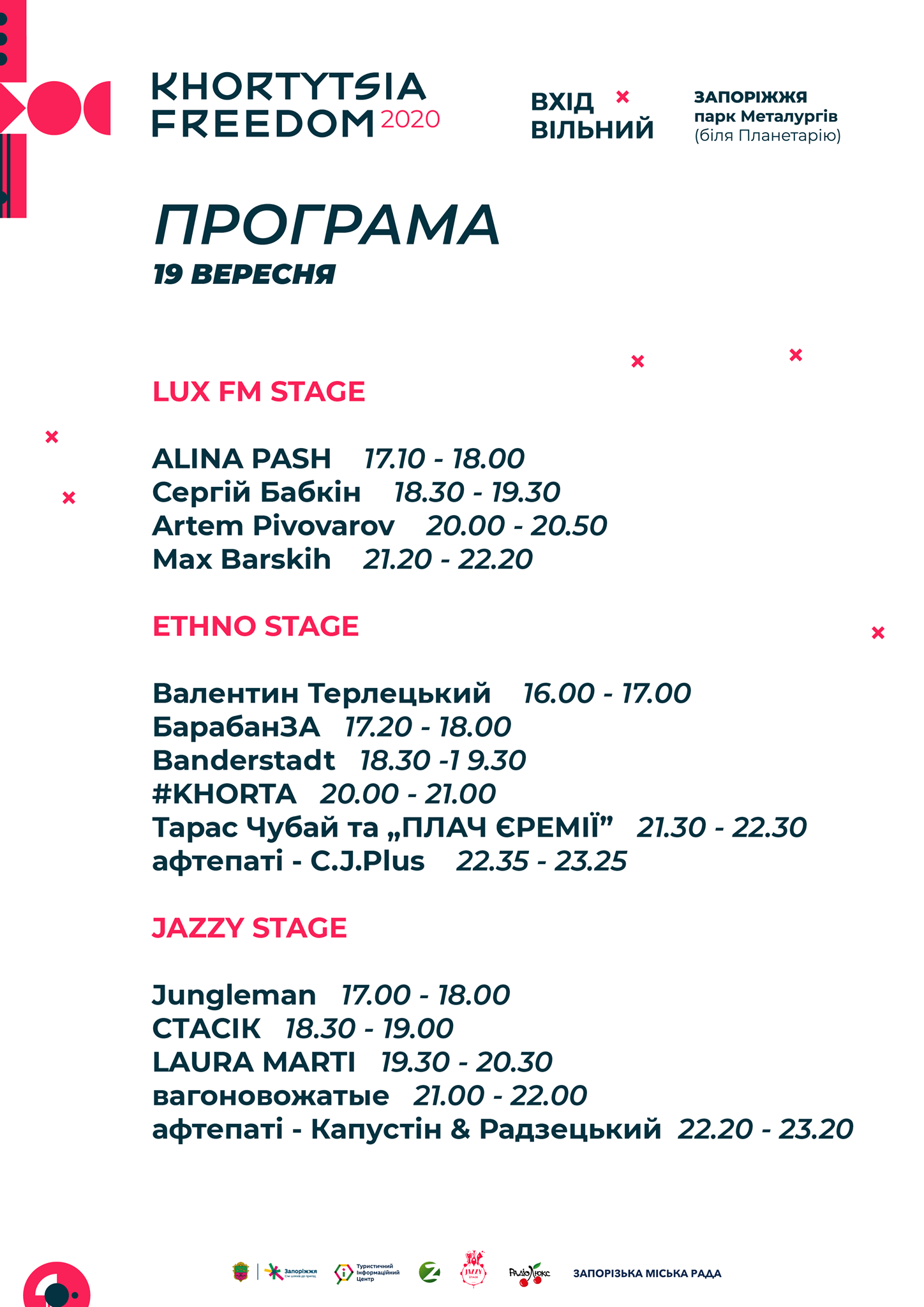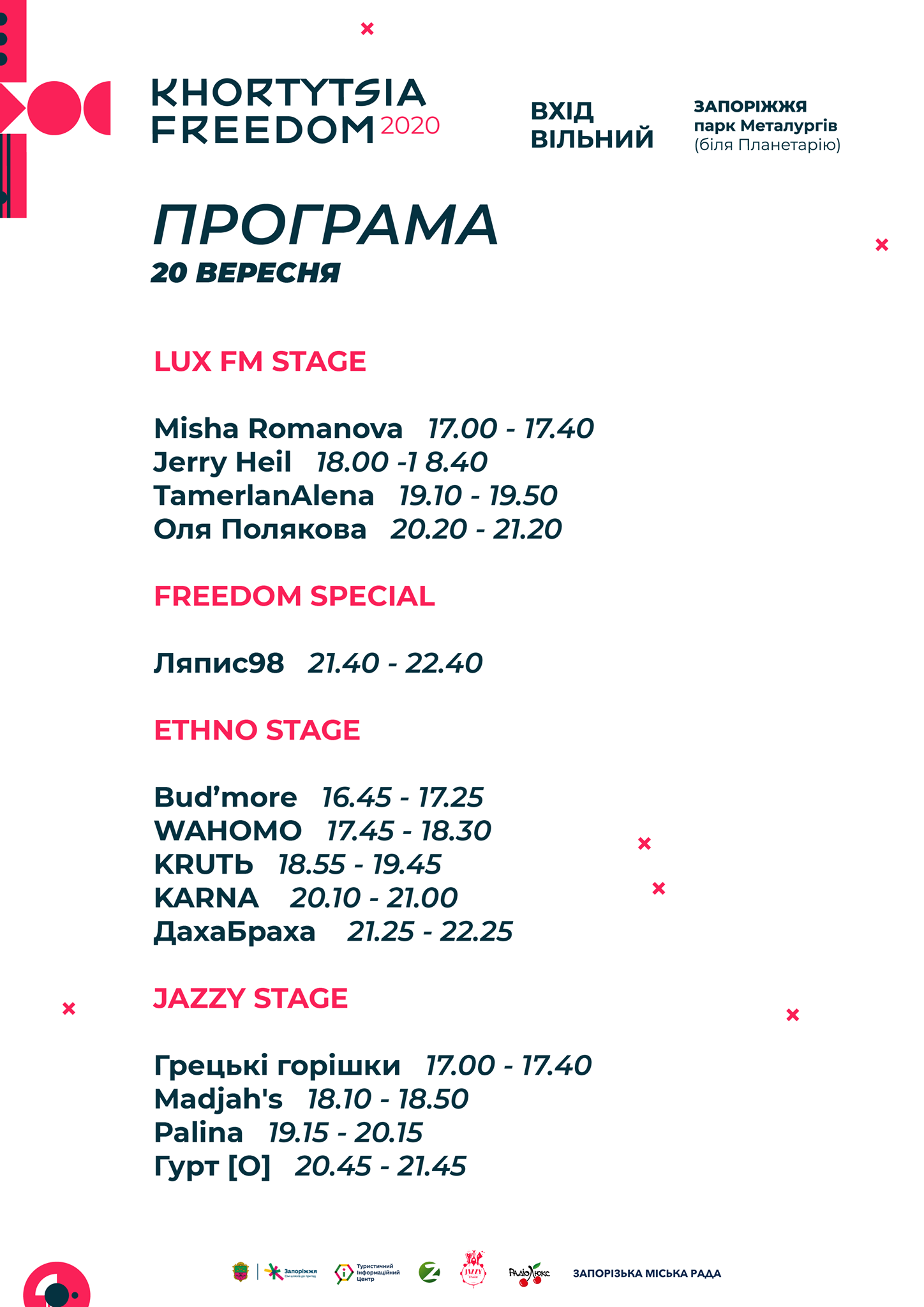 Музичний фестиваль Khortytsia Freedom відбуватиметься одночасно на трьох сценах. На кожній виступатимуть виконавці різного стилю, загалом – близько 30 топових виконавців та гуртів. Фестиваль триватиме два дні, упродовж яких для запоріжців співатимуть та гратимуть Сергій Бабкін, Max Barskih, Jerry Heil, Артем Пивоваров, Оля Полякова, Alina Pash, Декаданс, ХОРТА, Ляпіс-98, ДахаБраха, Вагоноважаті, KRUTЬ, Palina та багато інших. Навколо працюватимуть фуд-корти та будуть облаштовані фотозони.