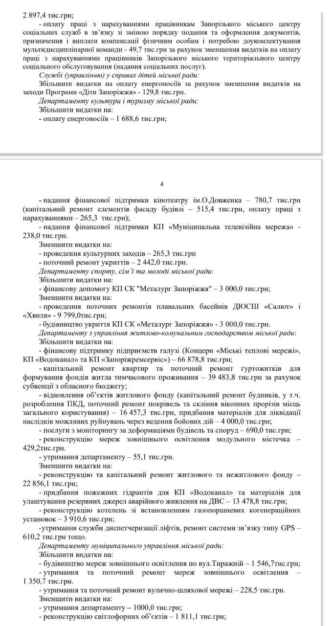 Управління транспорту пропонує виділити 20 млн грн на підтримку «Запоріжелектротрансу». Також підсилять: кінотеатр ім. Довженка — 780 тис. грн, Муніципальну телемережу — 238 тис. грн, спортклуб «Металург» — 3 млн грн. Районні адміністрації: ремонти дахів приватного сектору й доплати працівникам НП. Заплановано: 11,8 млн грн — ремонти покрівель у приватному секторі, 834 тис. грн — доплати працівникам, які виїжджають на місця подій, 1,17 млн грн — утримання адміністрацій.