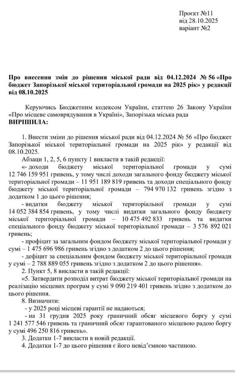 На найближчій сесії Запорізької міської ради депутати розглянуть один із найбільших пакетів змін до бюджету 2025 року. Його обсяг — сотні мільйонів гривень, а коригування торкнуться практично всіх галузей: від освіти та медицини до ЖКГ і транспорту.