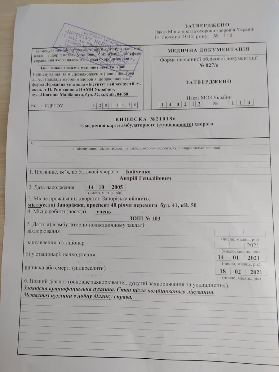 Коли в березні 2020 р. дізналися про свою біду, нас на швидкій транспортували в інститут ім.Ромаданова, м. Київ, де дитині провели складну операцію з видалення пухлини. Операція тривала вісім годин, в ній брала участь не одна бригада хірургів. Хочеться відзначити, що в Україні в інституті ім.Ромаданова проводять найскладніші операції, витягуючи дітей буквально з того світу. Як нам сказав хірург, він (Андрій ред.) і був однією ногою на тому світі, а інший на цьому. Чудовий хірург і людина Свист А.А., коли ми на швидкій, яку вы наймали власним коштом, приїхали, ми в прямому сенсі вбігли у відділення. Свист Андрій Олексійович, відразу ж зібрав консиліум, де обговорювався хід операції і призначена була дата. Операція пройшла успішно. Але як показав результат гістології, пухлина виявилася злоякісною. Дитині в інституті Рака призначили лікування. Він пройшов шість блоків хіміотерапії і 30 сеансів променевої терапії в Охматдит. Після кожних двох блоків проходили обстеження. Динаміка лікування була позитивна. Після променевої терапії через місяць пройшли обстеження голови і всього хребта. На МРТ показало пухлину в голові зліва. У січні 2021 дитині зробили ще операцію. Зараз проходимо хіміотерапію. Вже пройшли два блоки, попереду ще сім блоків і променева терапія. Як показав результат гістології пухлина дуже рідкісна, зараз відправили зразок її, щоб провести аналіз на молекулярно-генетичному рівні.