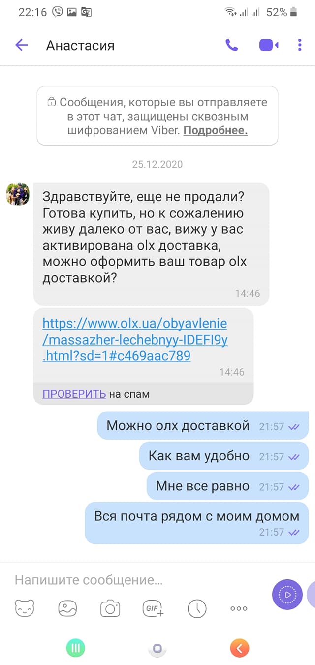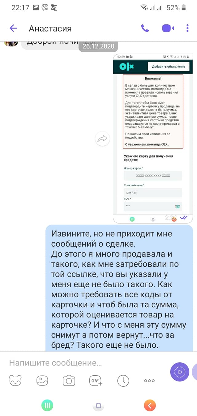 За словами жінки, шахраї спочатку переводять діалог на інший ресурс (ймовірно для того, аби OLX не заблокував сторонні посилання), а далі надсилають посилання-дублікат мережі OLX, за допомоги якого списують гроші з картки ошуканих користувачів, обіцяючи повернути від імені сайту. Коли ж клієнт починає підозрювати, що щось не так, то шахраї просто вмовляють і просять не звертати уваги на це.