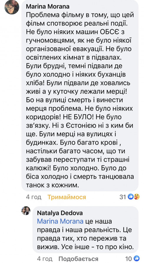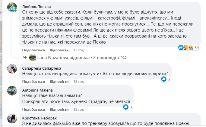 Але після перегляду фільму мешканці Маріуполя почали залишати обурені коментарі під постами творців стрічки. Вони вважають, що фільм недостатньо передає всі жахіття, через які їм довелося пройти. Тобто, історія правдива частково.