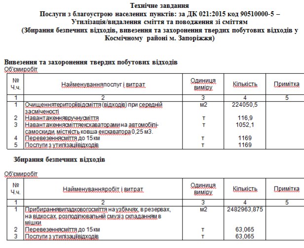 Згідно з тендерною документацією, підрядник має надавати послуги з збирання безпечних відходів, вивезення та захоронення твердих побутових відходів у Космічному районі Запоріжжя. Частину коштів — 3,35 млн грн — передбачили на прибирання випадкового сміття, ще 2,46 млн грн — на вивезення та захоронення твердих побутових відходів.