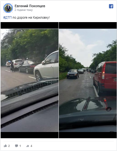 Очевидці в соціальних мережах сповістили, що дорозі між Якимівкою та Кирилівкою сталася аварія. Через це утворилися затори.