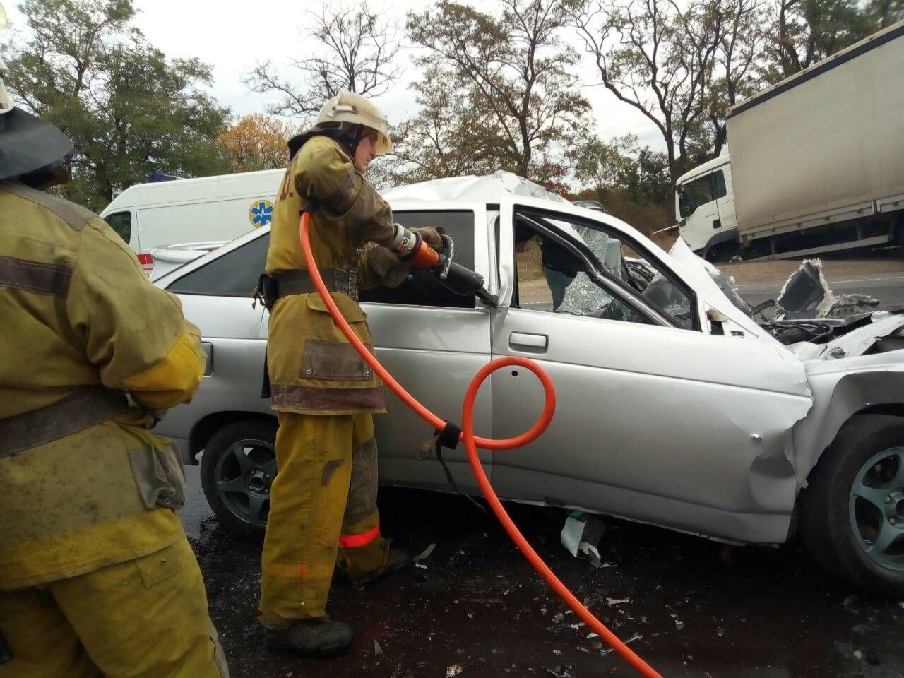 Рятувальники за допомогою спеціального обладнання вирізали тіло з понівеченого «ВАЗу». На жаль, жителю Мелітопольського району вже нічим не можна було допомогти, він загинув на місці. 45-річного мешканця Одеської області, водія вантажівки, з травмами доставили до лікарні.
