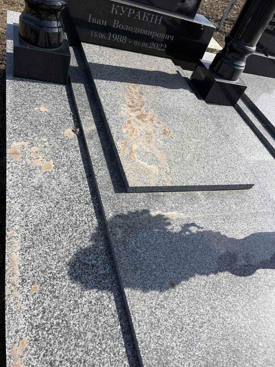 «На Вільнянському кладовищі вже втретє крадуть український прапор у нашого захисника Івана Куракіна та пошкоджують пам’ятник. З фото видно акт вандалізму, тому попереджаємо правопорушників, що справа взята на особливий контроль, а у разі повторної крадіжки прапору та пошкодження могили захисника, винних осіб буде притягнуто до адміністративної або кримінальної відповідальності відповідно до вимог чинного законодавства.