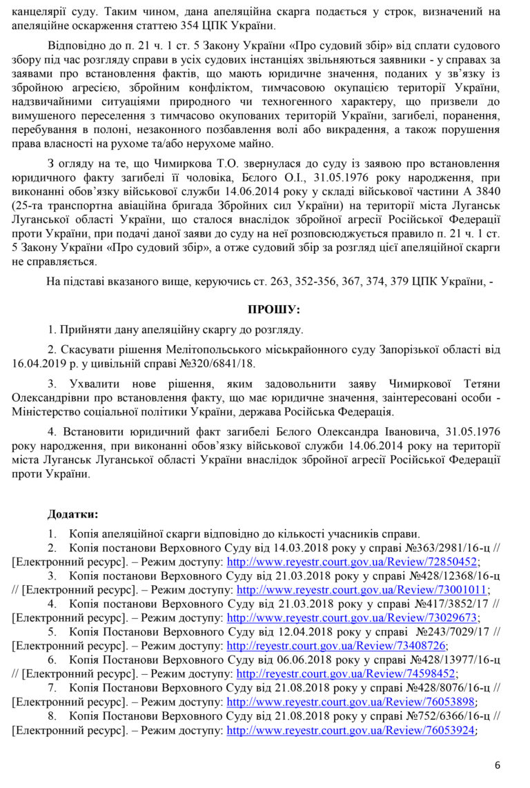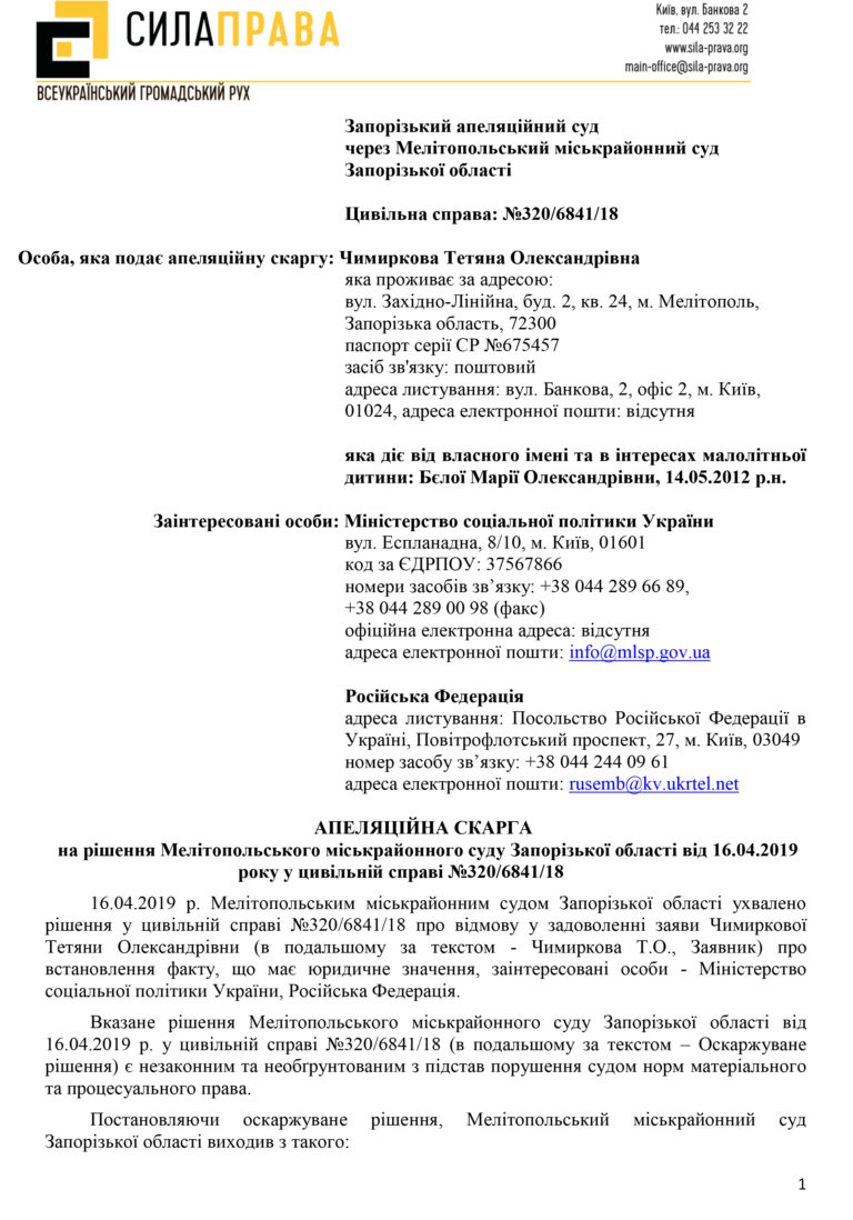 Учасники Всеукраїнського правозахисного руху «Сили права» подав апеляційну скаргу до апеляційного суду в інтересах вдови військового та його неповнолітньої донечки.