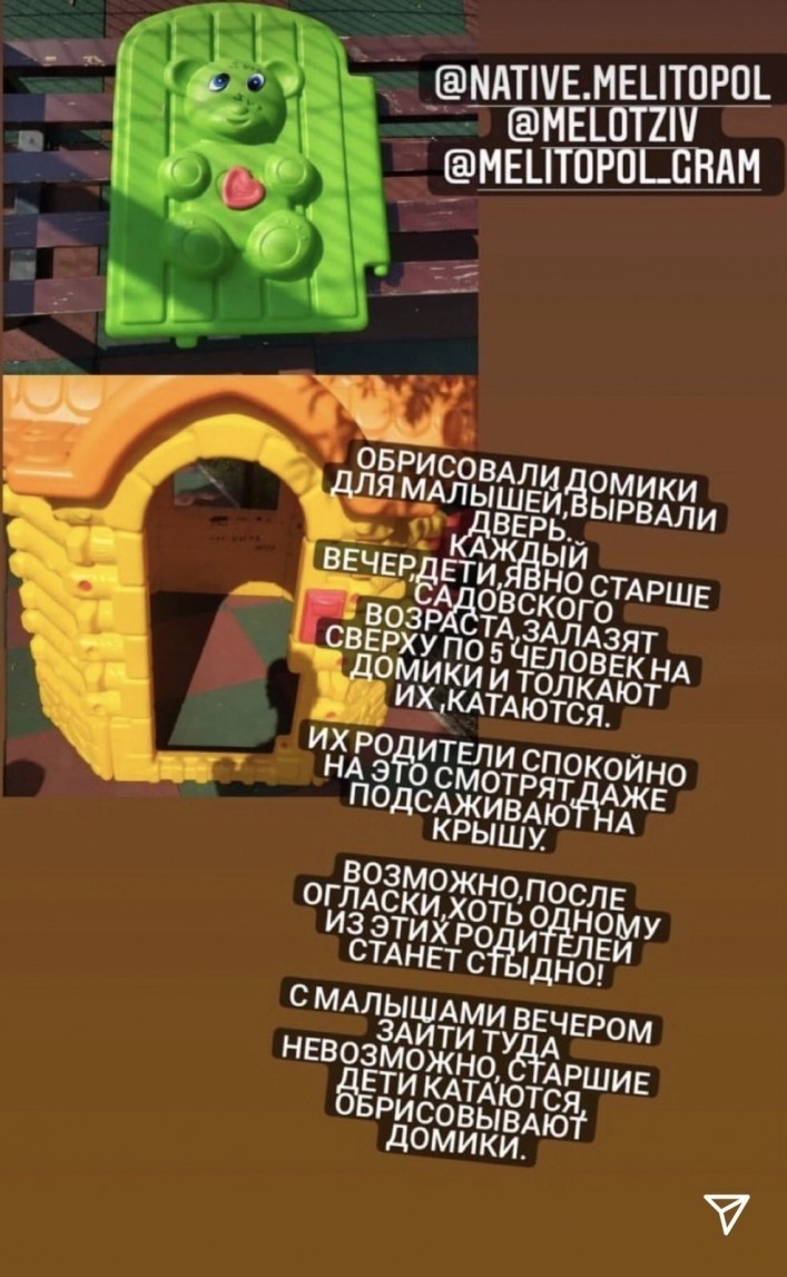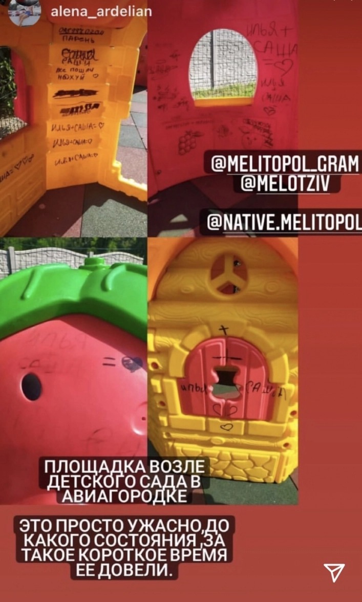 Восени минулого року в Мелітополі відреставрувати дитячий садок «Зірочка», який був розташований у Авіамістечку. Так, на подвір’ї цього садка з’явився майданчик, не тільки для вихованців, а й для дітей району.Не минуло й року як майданчик розмалювали вандали. Написи намалювали маркерами. Серед них є й нецензурна лексика. Дверцята відірвали і кинули поруч.