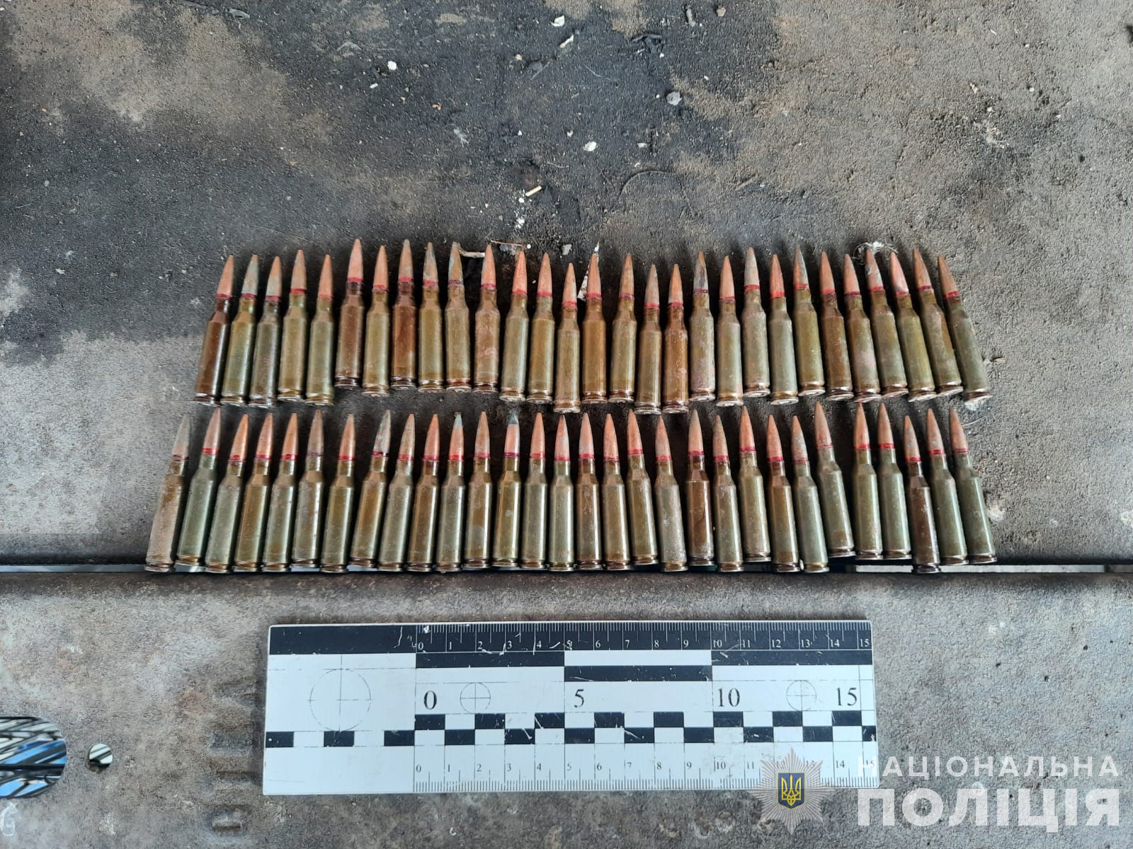 Після передачі товару поліцейські провели обшук у мешканця та виявили понад 120 набоїв калібру 5,45 мм, корпус гранати Ф-1, підривач типу УЗРГМ, 2 предмети, схожі на додаткові порохові заряди до мінометних пострілів, та майже 400 одиниць пострілів калібру 23 мм.