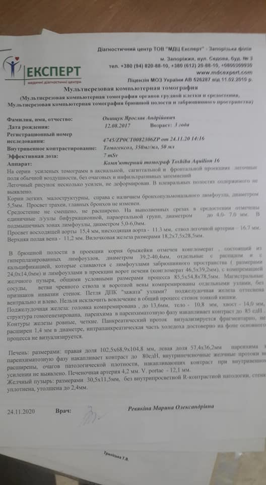 У трирічного Ярослава Онищука з Мелітополя виявили онкологію – нейробластому четвертої стадії. Нині хлопчик проходить курс хіміотерапії у Києві. Лікування дороговартісне та складне, повідомляє РІА.Мелітополь. За словами матері хлопчика Тетяни, її син ще слабкий, сам не їсть. Попереду на хлопчика чекає відновлення, ще одна аутотрансплантація та імунотерапія.
