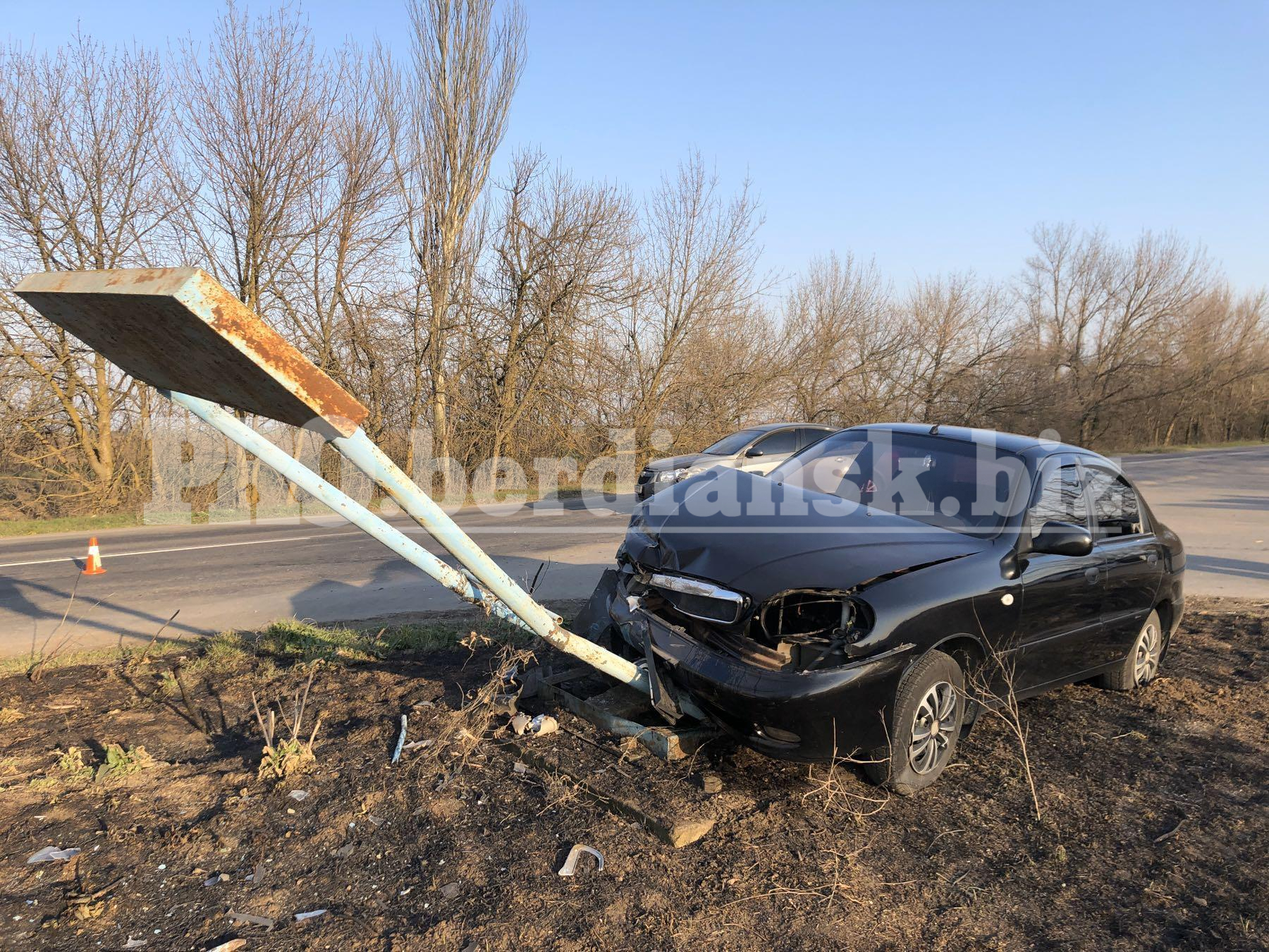 В результаті удару один з транспортних засобів виїхав з дороги та врізався в дорожні знак на якому написано «Аеропорт».