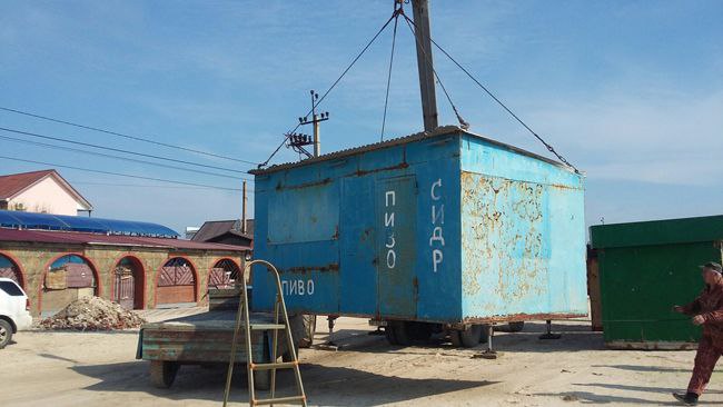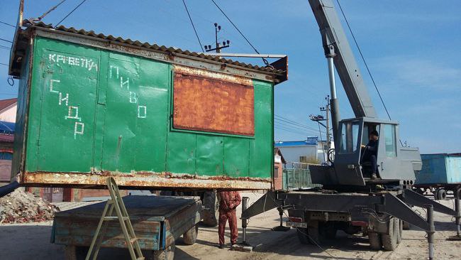 Старі залізні кіоски прибирають за допомогою крану з узбережжя курорту.