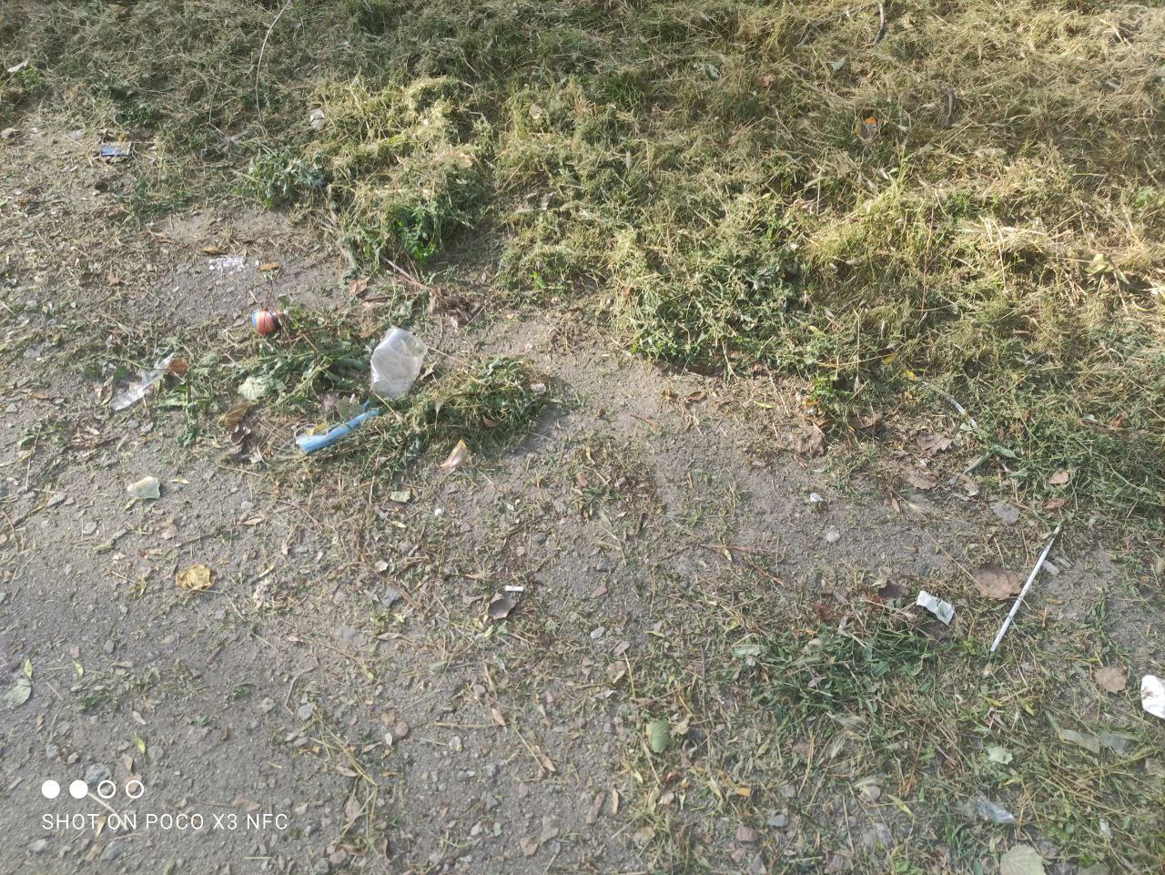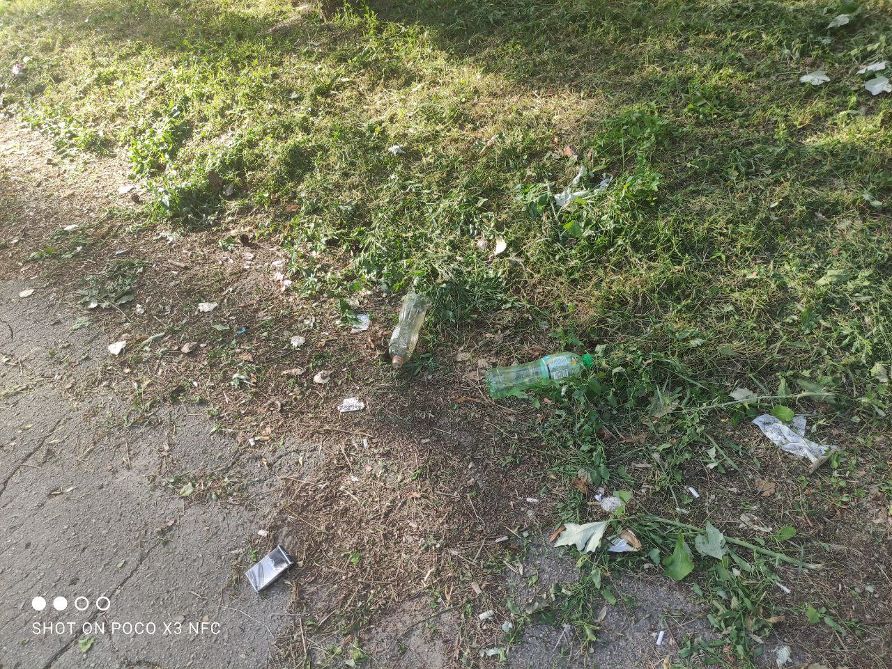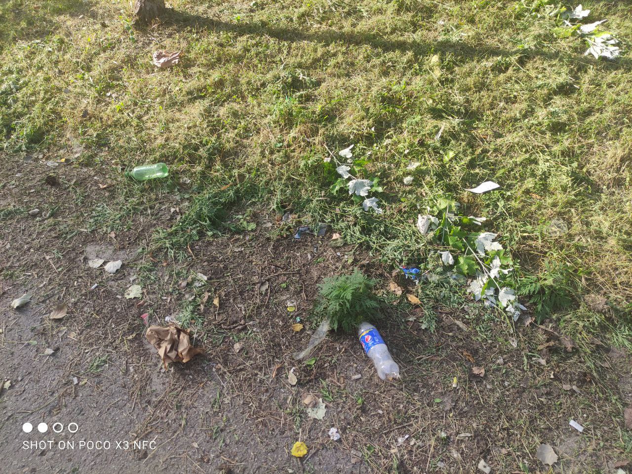 Біля майданчика стоять мішки зі сміттям. Їх хтось розірвав, тож сміття валяється в перемішку зі скошеною травою.
