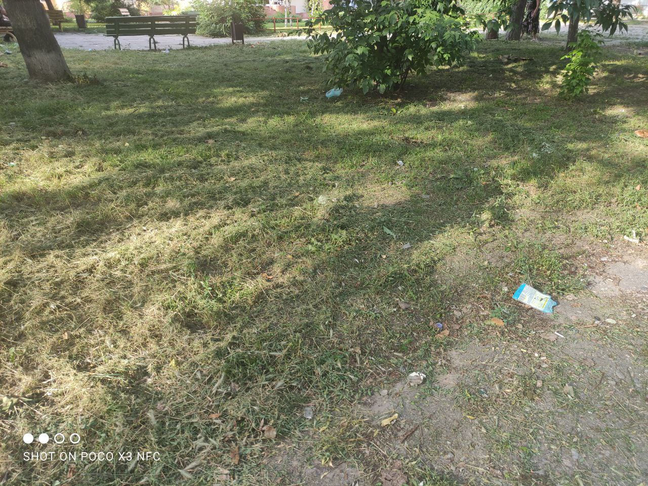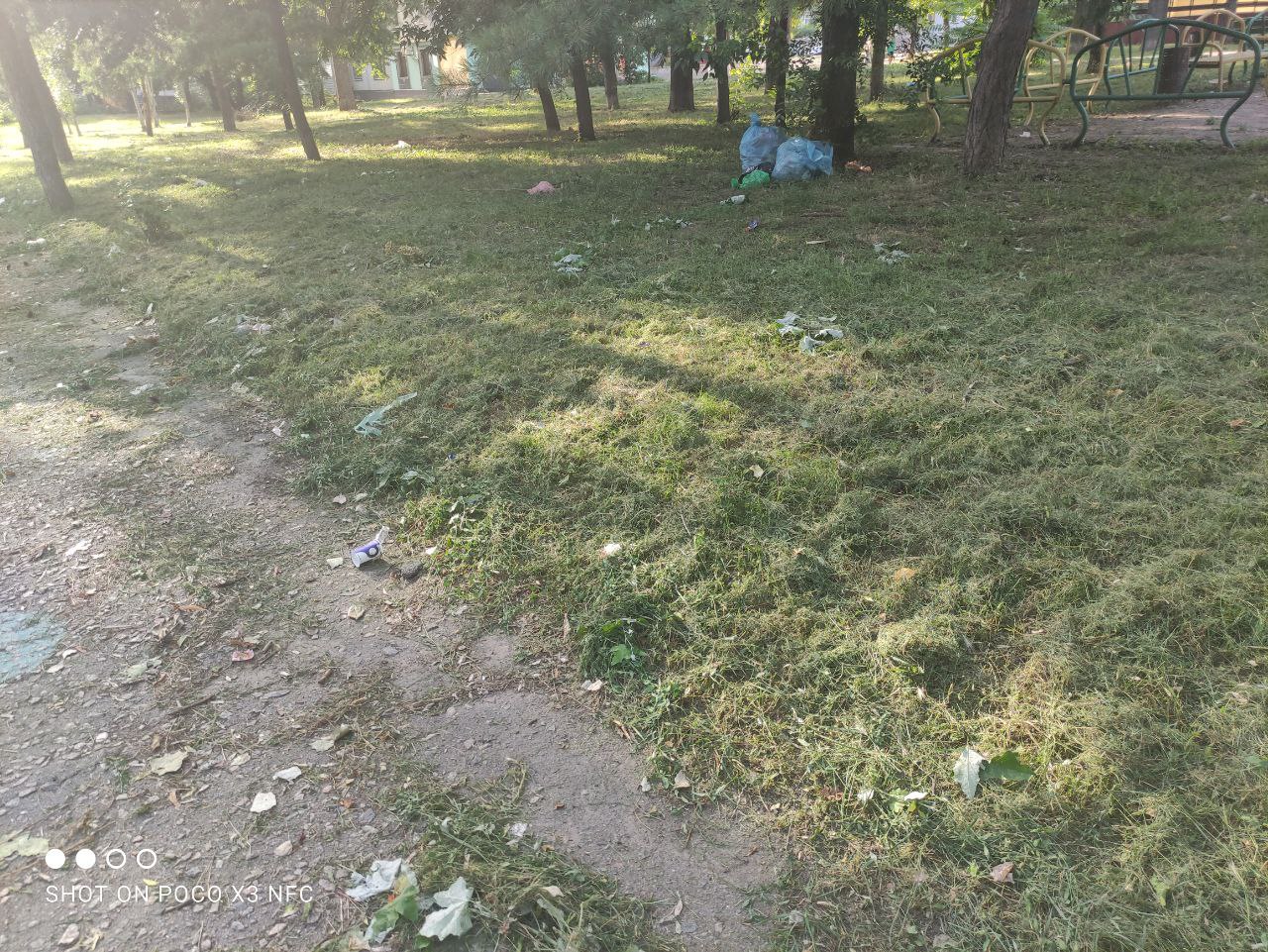 В Космічному мікрорайоні Запоріжжя, на дитячому майданчику між вулицями Європейською та Висотною газон всіяний сміттям. Видно, що його хтось розтяг із мішків, які стоять під самою огорожею майданчика. Траву нещодавно косили і сміття змішане із покошеними бур’янами. Яка небезпека може чаїтися в смітті, і чи загрожує щось дітям — не відомо, але таке сусідство точно є небезпечним.