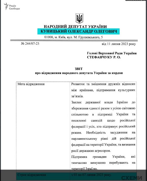 Олександру Куницькому дозволили виїхати до Ізраїлю з 3 по 7 липня «в рамках діяльності депутатської групи ВРУ з міжпарламентських зв’язків з Ізраїлем». Мета поїздки – «розвиток та зміцнення дружніх відносин між країнами». Серед партнерів на зустрічах були члени Кнесету, представники єврейської спільноти, релігійних громад та громадяни України, які перебувають тимчасово в Ізраїлі. Конкретних прізвищ нардеп не назвав.