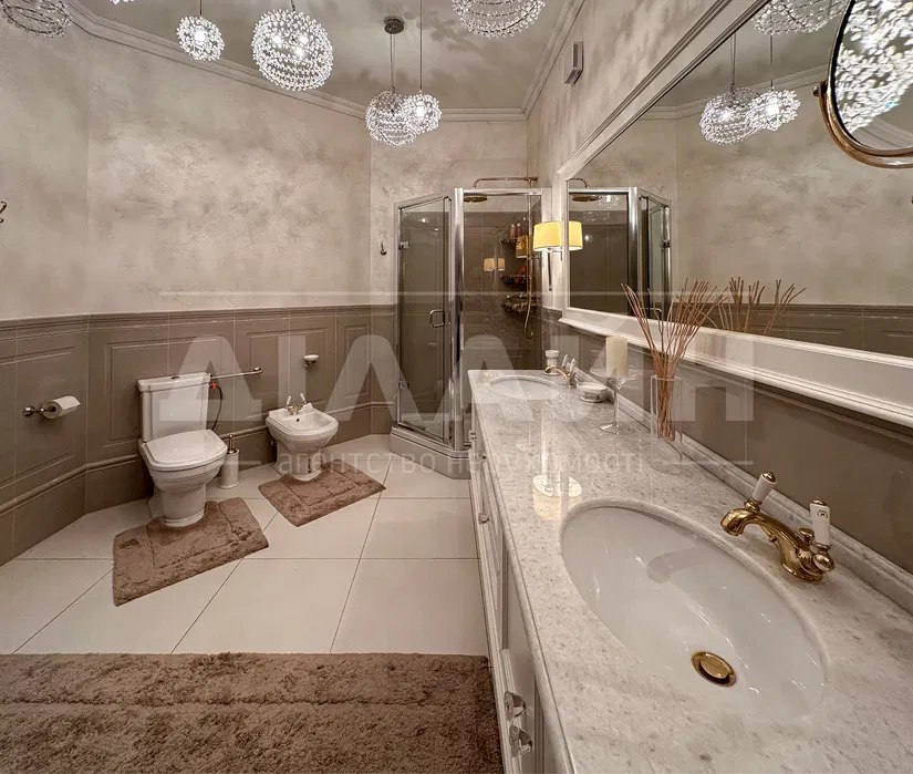 Інтер’єр виконаний у неокласичному стилі з мармуровими підлогами, декоративними панелями, дизайнерським освітленням і меблями преміум-класу.