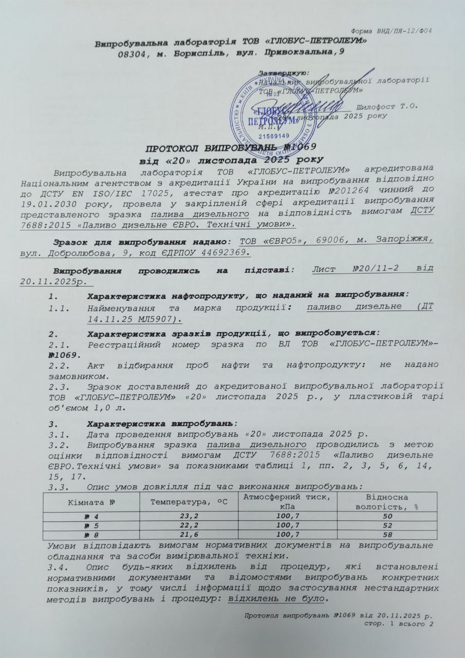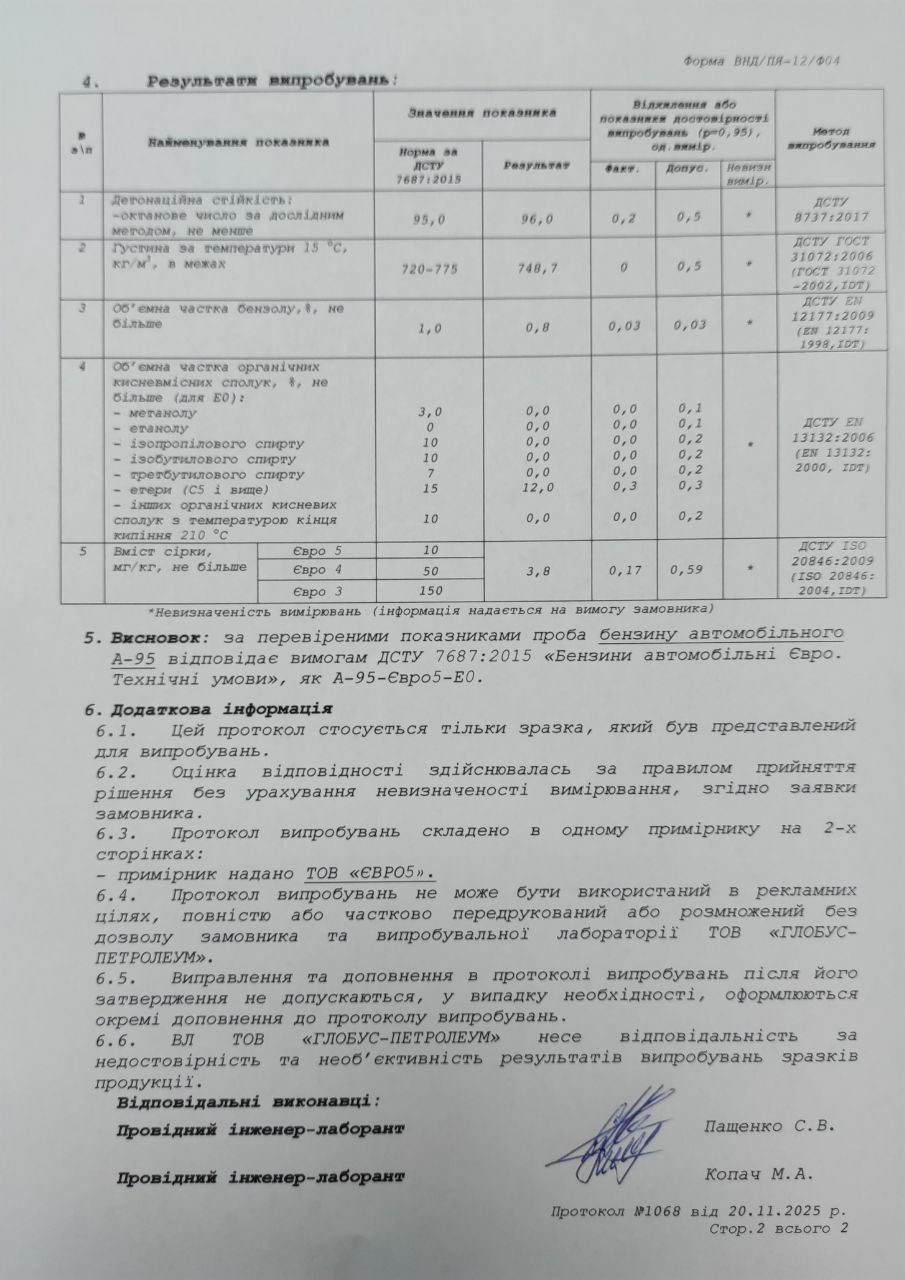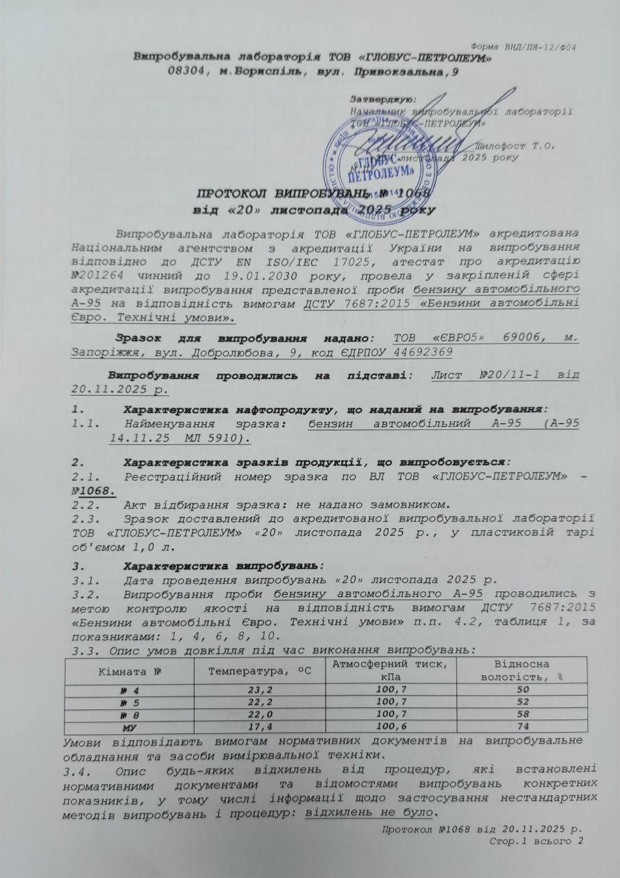 Мережа АЗС EURO 5 оприлюднила нові результати перевірки пального — бензину автомобільного А-95-Євро5-Е0 та ДП-З-Євро5 за 20 листопада 2025 року. Дослідження проводила незалежна акредитована лабораторія ТОВ «Глобус-Петролеум».