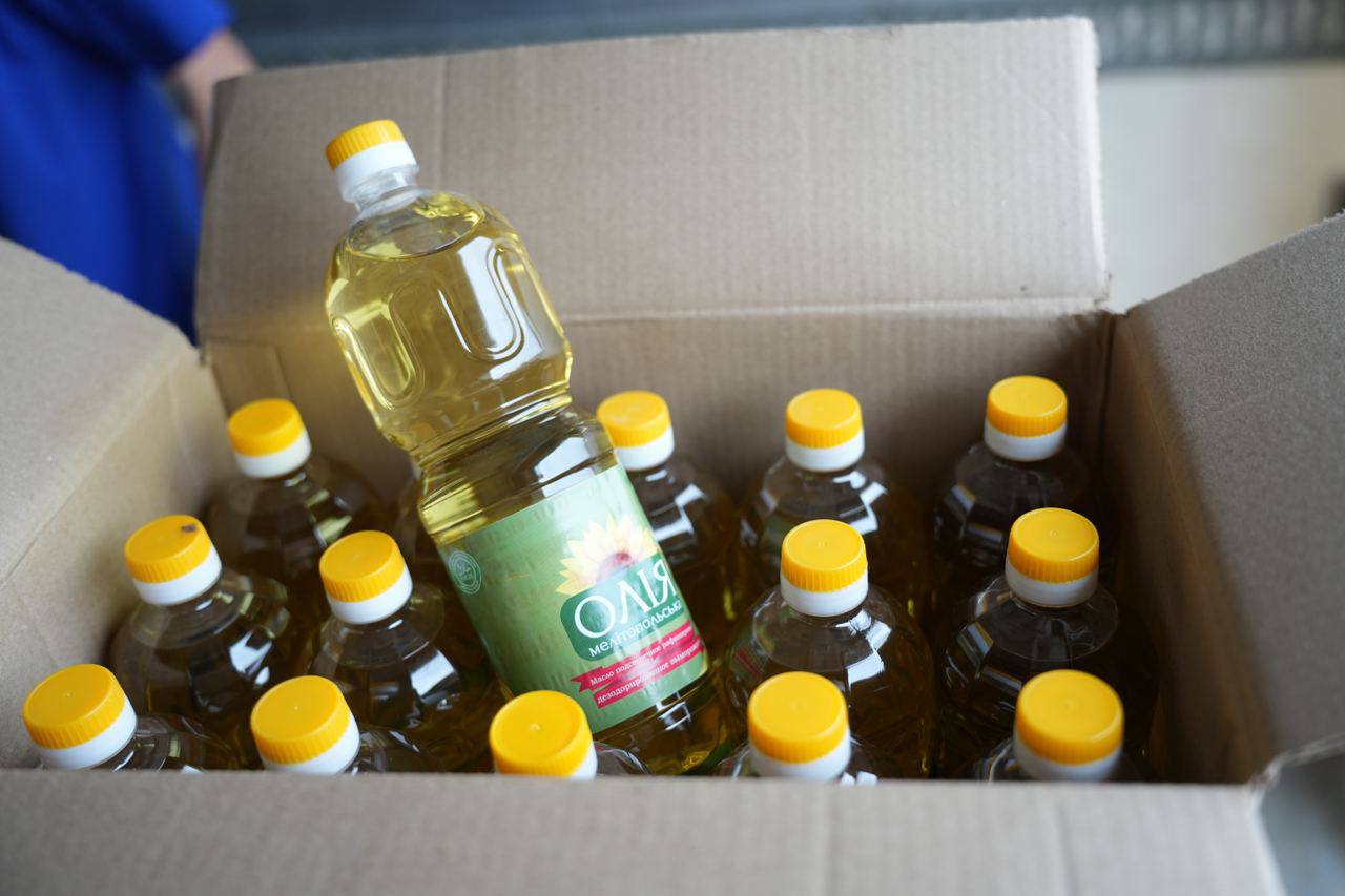 Цікаво, що на фото добре видно, що на пляшках з олією напис українською мовою: “Олія мелітопольска”.