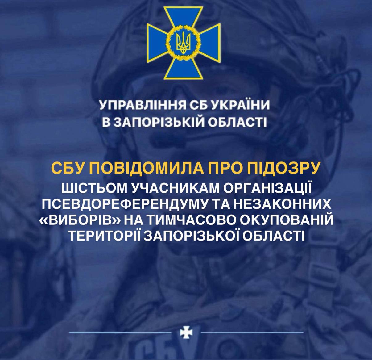 Служба безпеки України викрила ще шістьох пособників РФ, які брали участь в організації та проведенні незаконного «референдуму», а також подальших псевдовиборів на тимчасово окупованій території Запорізької області.