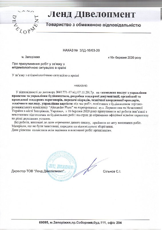 З’явився документ в якому вказано, що у зв’язку з карантином, який ввели в Запоріжжі 16 березня через загрозу поширення коронавірусу, призупиниться роботи з початку будівництва ТРЦ «Ленд Дівелопмент», повідомляє «Z-city». Роботу там мали розпочатися саме з 16 березня.