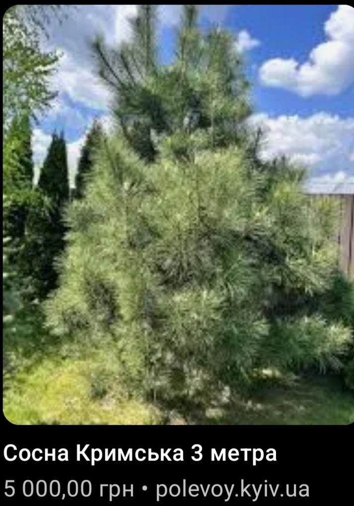 Окремою коштовною позицією може бути кримська сосна. Молоді саджанці коштують від 110 до 350 гривень, однак дерева висотою 2–3 метри вже продають за 4–5 тисяч гривень, а великі декоративні екземпляри можуть коштувати десятки тисяч гривень.