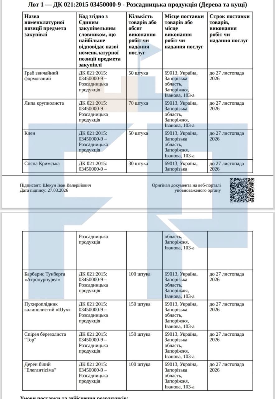 За умовами тендеру, поставити всі дерева та кущі мають до 27 листопада 2026 року. Тендерні пропозиції прийматимуть до 4 квітня, а сам аукціон має відбутися 6 квітня.
