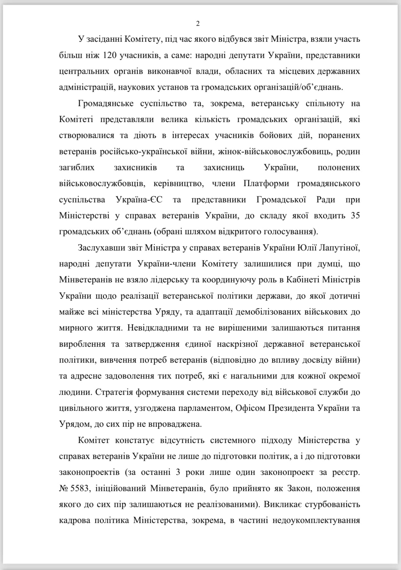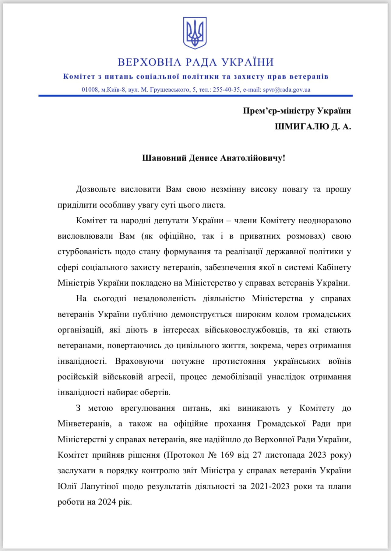 «Комітет соцполітики і захисту прав ветеранів Верховної Ради звертається до Шмигаля щодо звільнення міністра ветеранів Лапутіної, посилаючись на тиск ветеранського середовища.