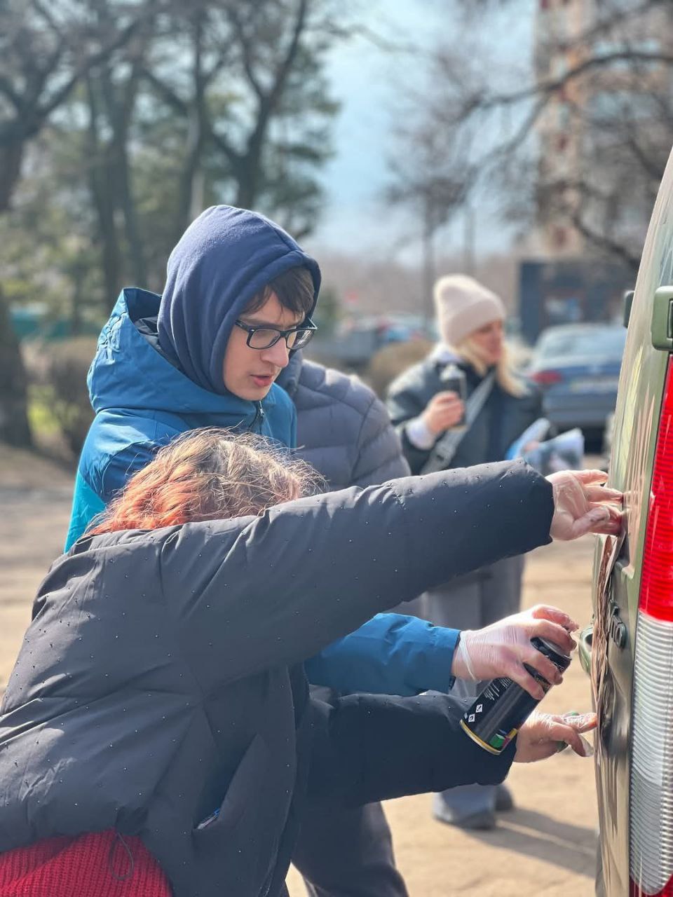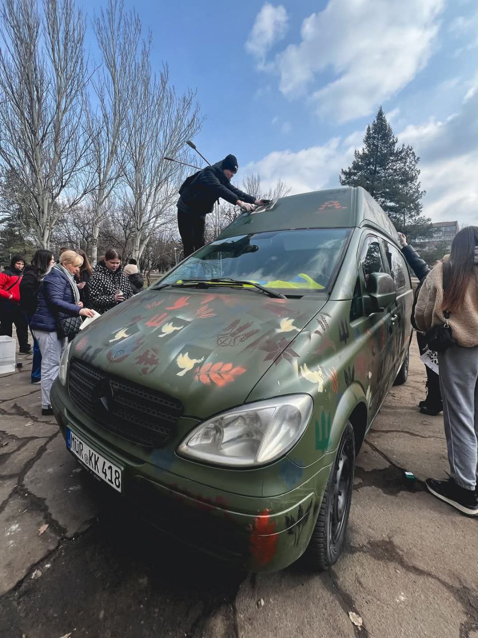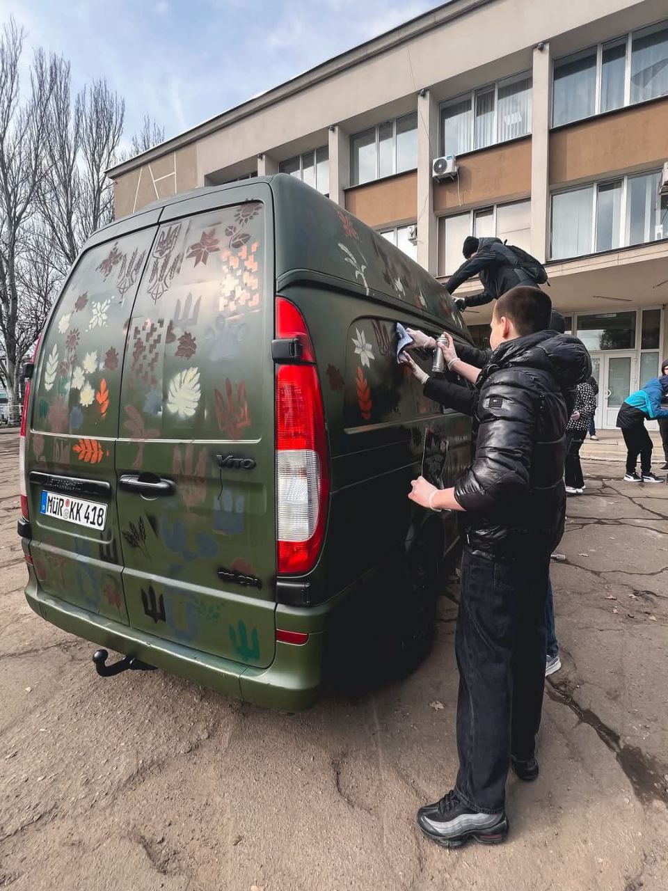 Вибравши балончики з фарбою і трафарети, вони розфарбувати машину, яка вже сьогодні поїхала до наших хлопців на Донецький напрямок.