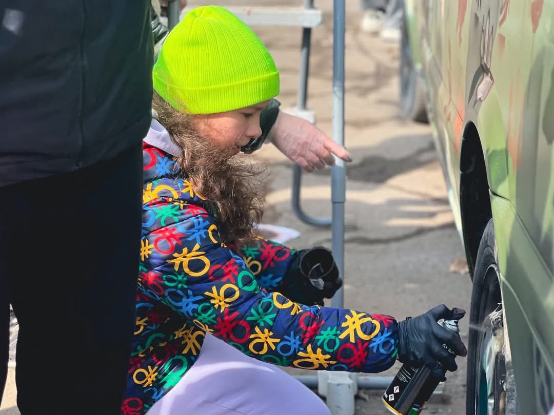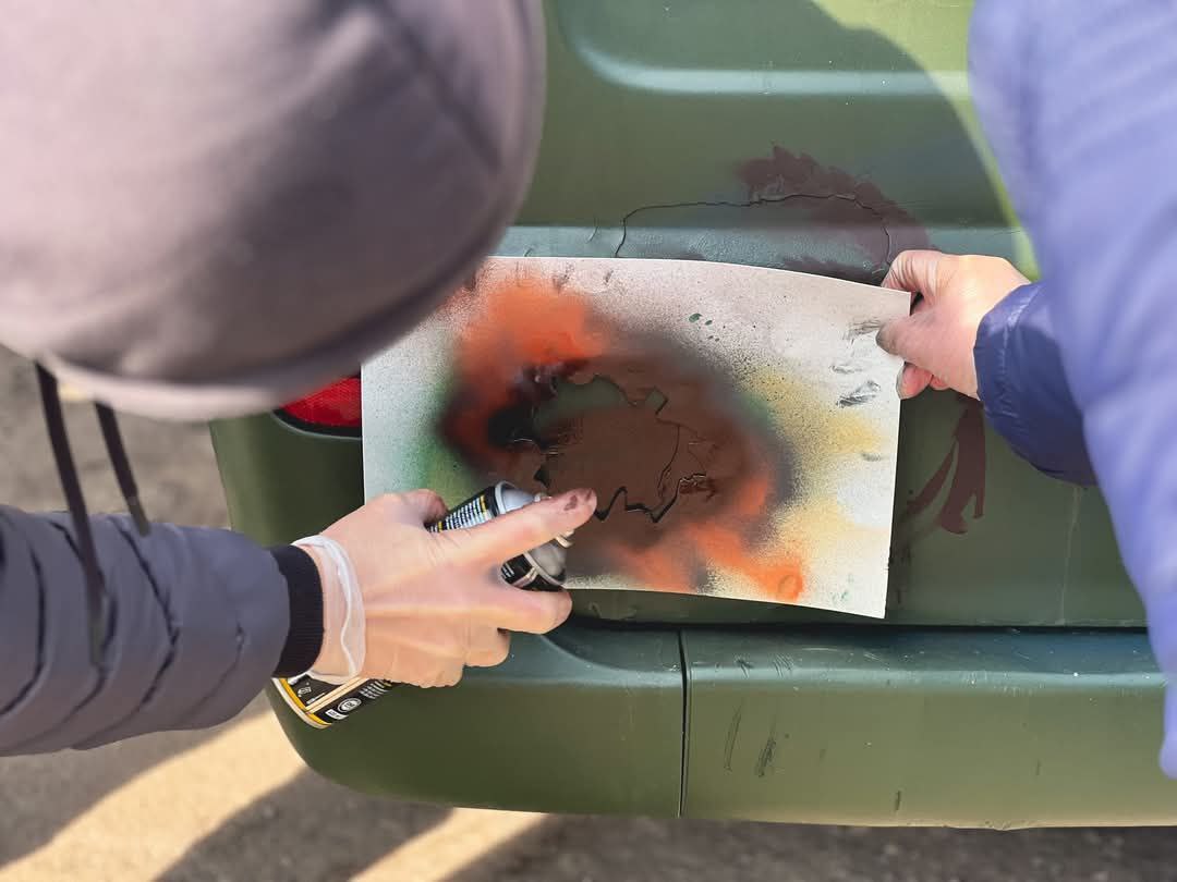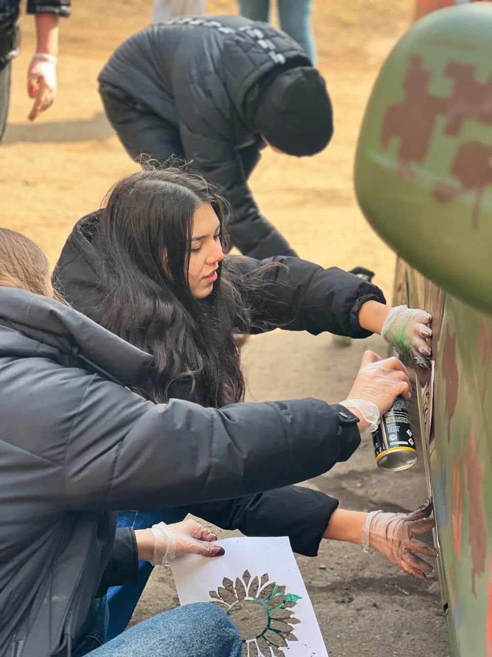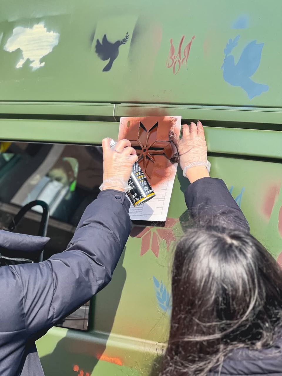 Вибравши балончики з фарбою і трафарети, вони розфарбувати машину, яка вже сьогодні поїхала до наших хлопців на Донецький напрямок.