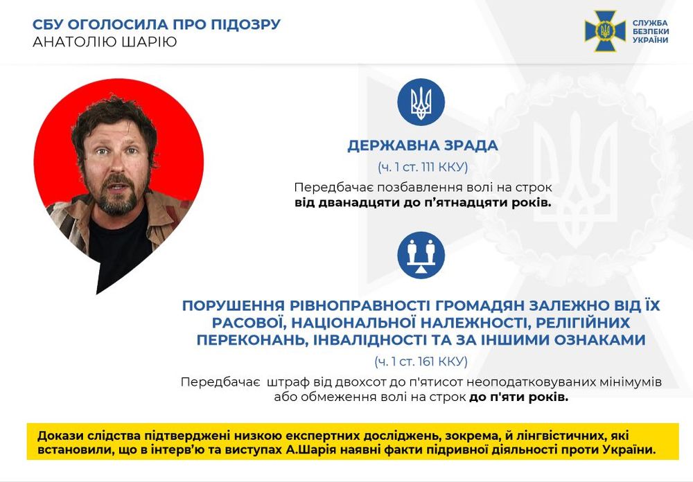 У Службі безпеки України оголосили підозру Анатолію Шарію за двома статтями Кримінального кодексу.
