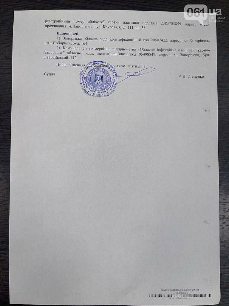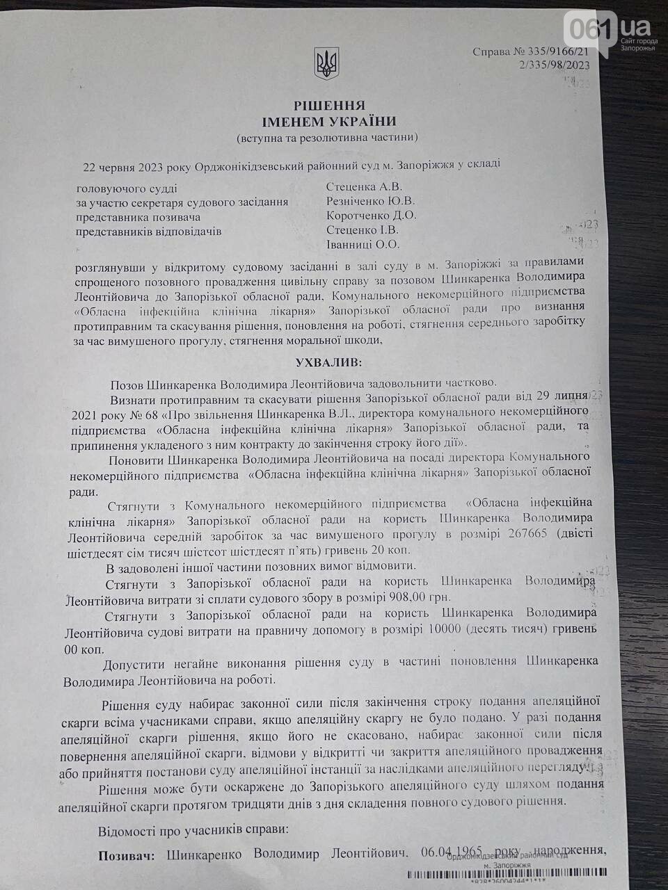 22 червня Орджонікідзевський районний суд м. Запоріжжя виніс рішення про визнання протиправним та скасування рішення про звільнення Володимира Шинкаренка з посади директора КНП «Обласна інфекційна лікарня» Запорізької області. Окрім того, що його мають поновити, суд ще й зобов’язав виплатити Шинкаренку компенсацію за час вимушеного прогулу.