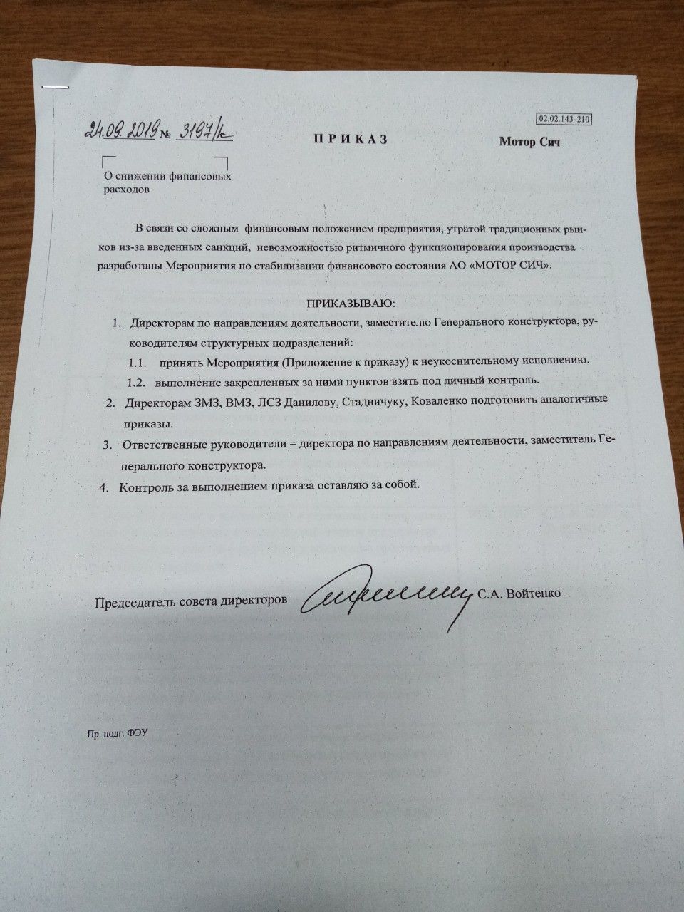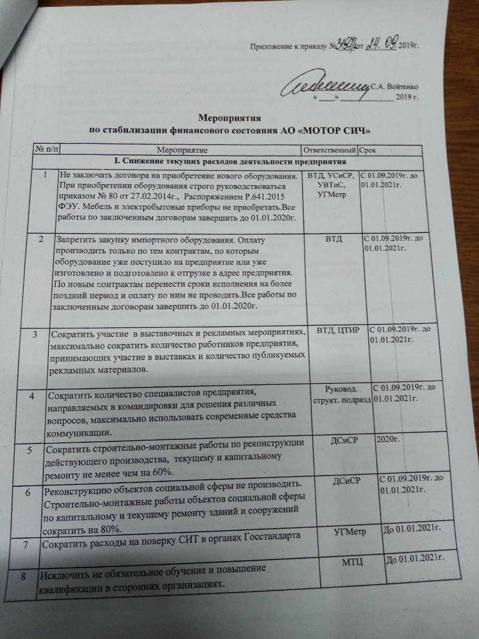 Вчора, 24 вересня, одне з провідних у світі підприємств з розробки, виробництва, ремонту та сервісного обслуговування авіаційних газотурбінних двигунів для літаків та вертольотів, а також промислових газотурбінних установок ПАТ «Мотор Січ», співробітники підписали наказ «Про зниження фінансових витрат.