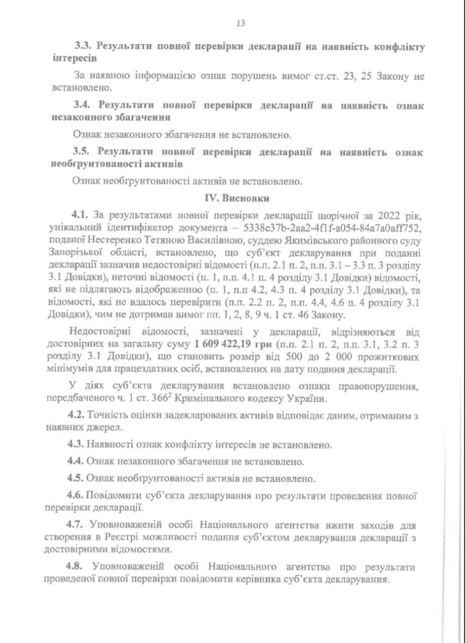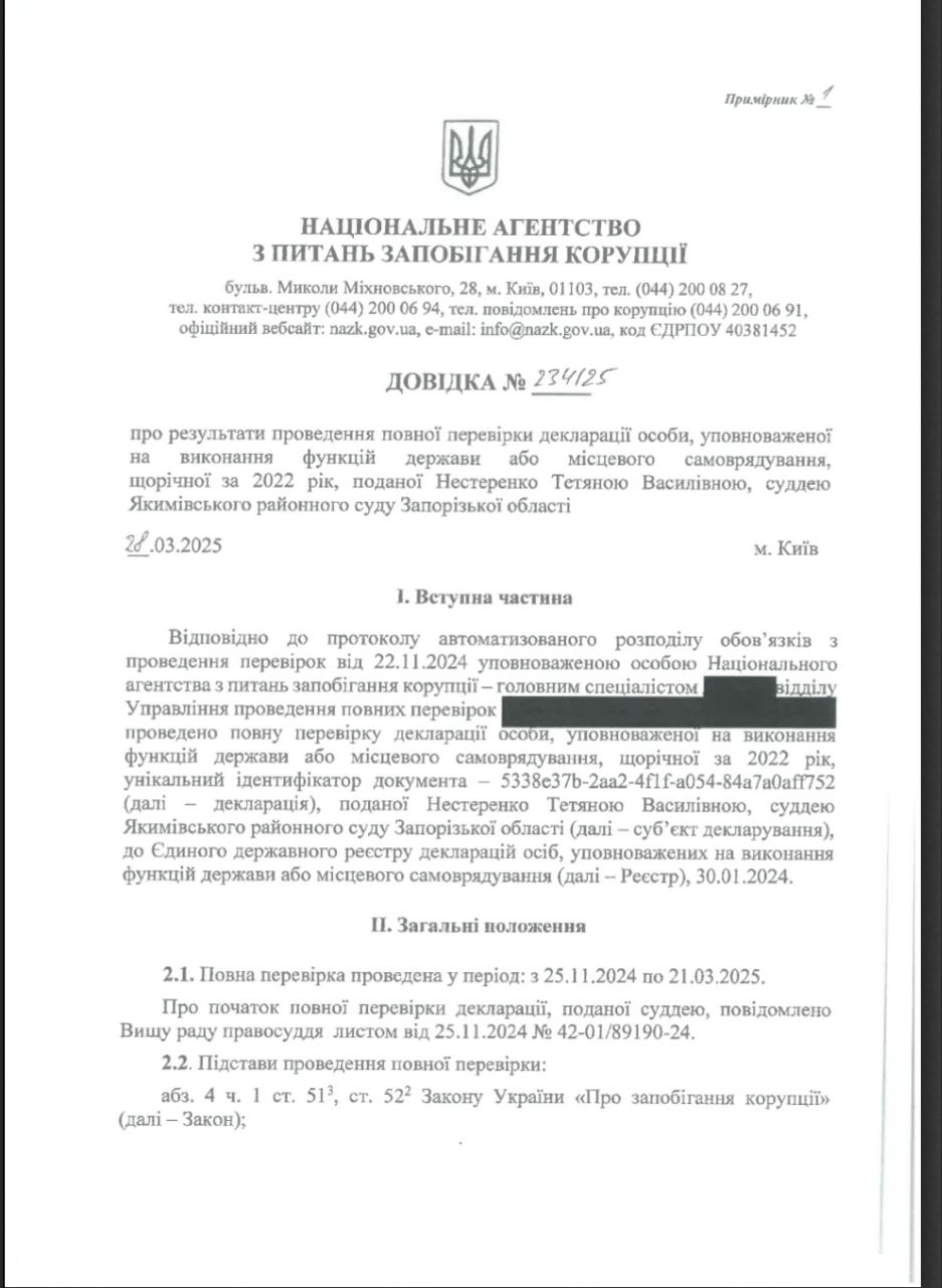 Національне агентство з питань запобігання корупції (НАЗК) виявило ознаки недостовірних відомостей в деклараціях судді Якимівського районного суду Запорізької області Тетяни Нестеренко.