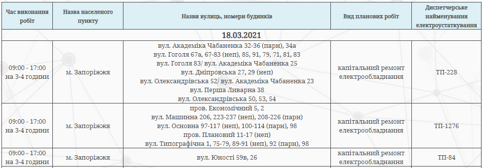 4 дні співробітники ПАТ “Запоріжжяобленерго” будуть проводити ремонтні роботи. У зв’язку з цим, тисячі абонентів залишаться 15,16,17,18 березня без енергопостачання Відповідна інформація з’явилася на сайті підприємства.